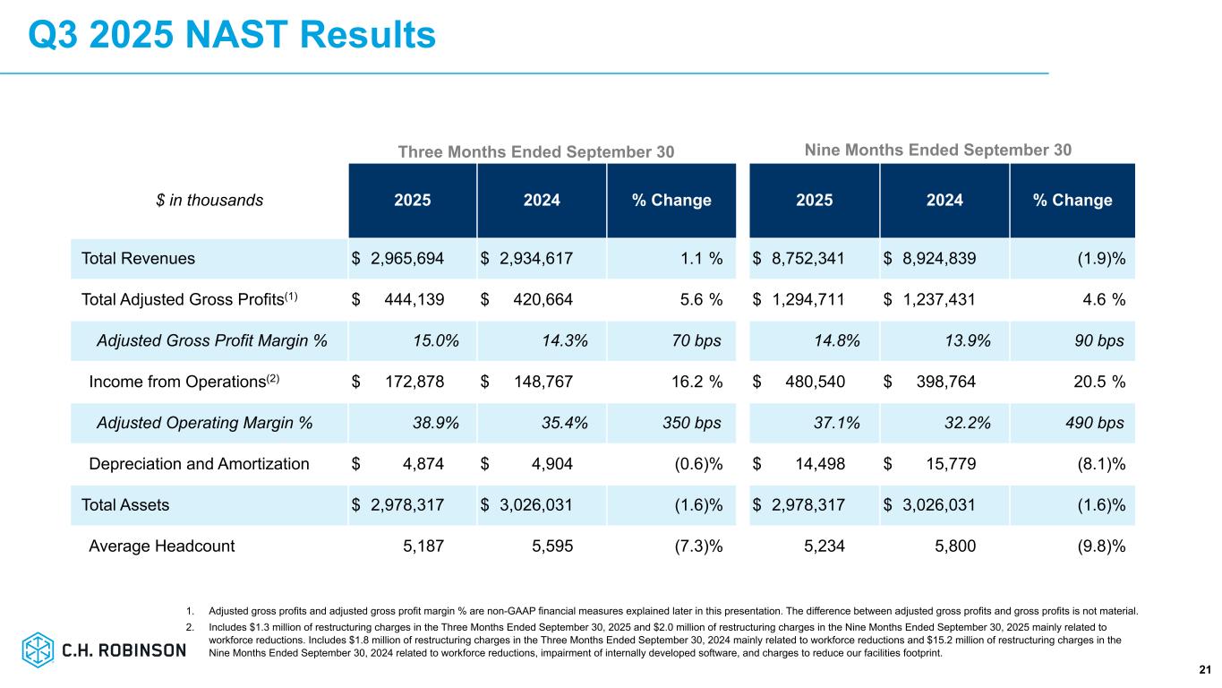 Non-GAAP Reconciliations 26 Our adjusted income (loss) from operations, adjusted operating margin - excluding restructuring, lease impairment charge and/or loss on divestiture, adjusted net income and adjusted net income per share (diluted) are non-GAAP financial measures. These non-GAAP measures are calculated excluding the impact of restructuring, lease impairment, and/or losses from divestiture. We believe that these measures provide useful information to investors and include them within our internal reporting to our chief operating decision maker. Accordingly, the discussion of our results of operations includes discussion on the changes in our adjusted income (loss) from operations, adjusted operating margin - excluding restructuring, lease impairment charge and/or loss on divestiture, adjusted net income and adjusted net income per share (diluted). The reconciliation of these non-GAAP measures are presented below (in thousands except per share data): Three Months Ended September 30, 2025 Nine Months Ended September 30, 2025 NAST Global Forwarding All Other and Corporate Consolidated NAST Global Forwarding All Other and Corporate Consolidated Income (loss) from operations $ 172,878 $ 49,021 $ (1,063) $ 220,836 $ 480,540 $ 143,294 $ (10,226) $ 613,608 Severance and other personnel expenses 1,199 8,403 126 9,728 1,876 10,979 1,948 14,803 Other selling, general, and administrative expenses 75 127 (176) 26 75 127 7,672 7,874 Total adjustments to income (loss) from operations(1)(2) 1,274 8,530 (50) 9,754 1,951 11,106 9,620 22,677 Adjusted income (loss) from operations $ 174,152 $ 57,551 $ (1,113) $ 230,590 $ 482,491 $ 154,400 $ (606) $ 636,285 Adjusted gross profit $ 444,139 $ 191,755 $ 70,183 $ 706,077 $ 1,294,711 $ 563,964 $ 213,721 $ 2,072,396 Adjusted income (loss) from operations 174,152 57,551 (1,113) 230,590 482,491 154,400 (606) 636,285 Adjusted operating margin - excluding lease impairment charge, restructuring, and loss on divestiture 39.2% 30.0% N/M 32.7% 37.3% 27.4% N/M 30.7% $ in 000's per share $ in 000's per share Net income and per share (diluted) $ 162,987 $ 1.34 $ 450,760 $ 3.71 Lease impairment charge, pre-tax — — 6,259 0.05 Restructuring and related costs, pre-tax 9,930 0.07 13,811 0.11 (Gain) loss on divestiture, pre-tax (176) — 2,607 0.02 Tax effect of adjustments (2,449) (0.01) (4,480) (0.03) Adjusted net income and per share (diluted) $ 170,292 $ 1.40 $ 468,957 $ 3.86 1. The Three Months Ended September 30, 2025 includes severance and other personnel expenses of $9.7 million related to workforce reductions. 2. The Nine Months Ended September 30, 2025 includes severance and other personnel expenses of $14.8 million related to workforce reductions and $7.9 million of other charges, which includes a $6.3 million impairment charge on our Kansas City regional center lease resulting from the execution of a sublease agreement on a portion of the building.