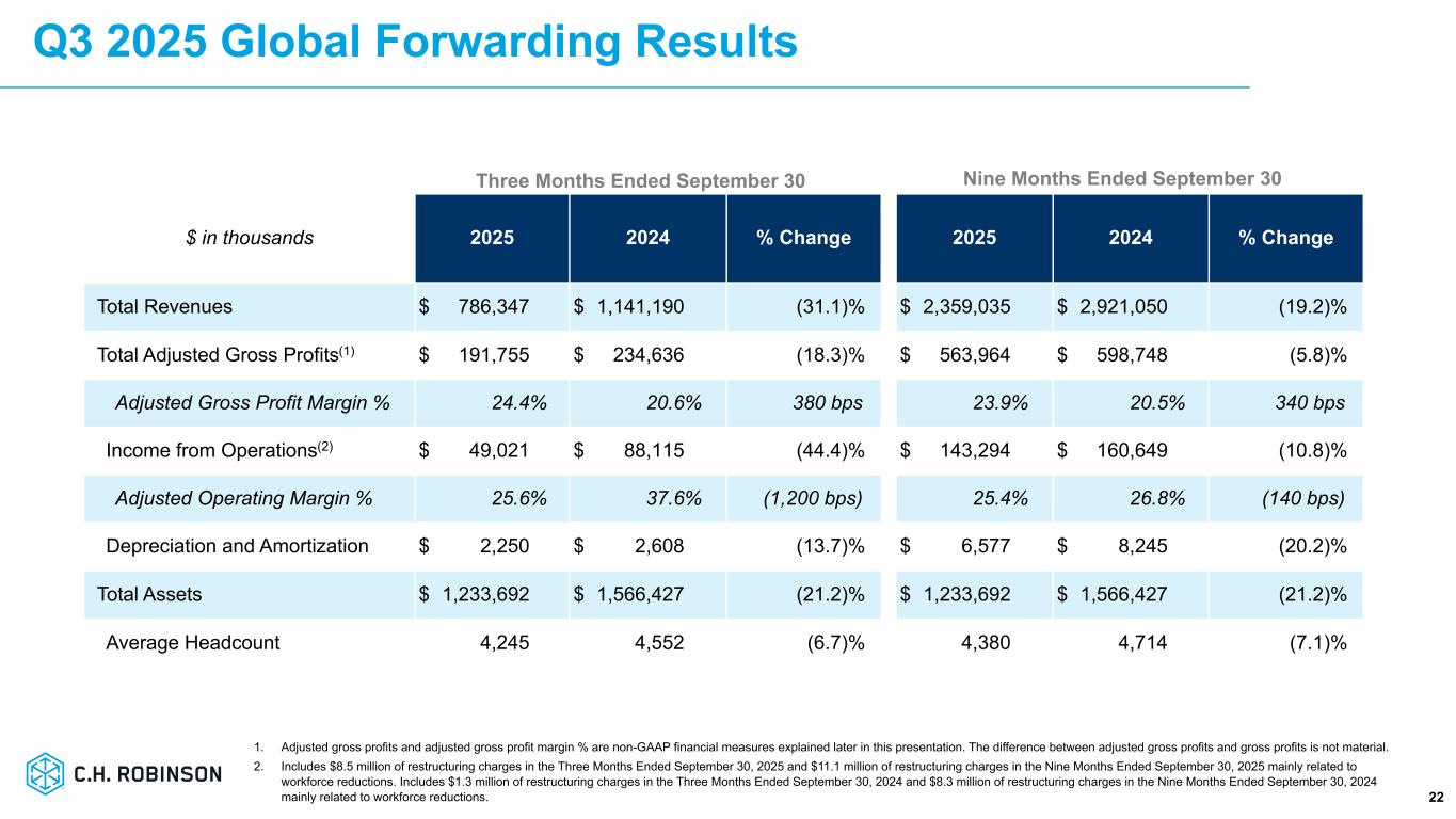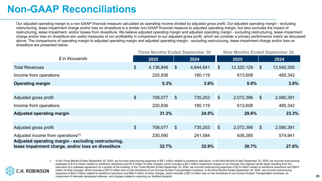 Non-GAAP Reconciliations 25 Our adjusted operating margin is a non-GAAP financial measure calculated as operating income divided by adjusted gross profit. Our adjusted operating margin - excluding restructuring, lease impairment charge and/or loss on divestiture is a similar non-GAAP financial measure to adjusted operating margin, but also excludes the impact of restructuring, lease impairment, and/or losses from divestiture. We believe adjusted operating margin and adjusted operating margin - excluding restructuring, lease impairment charge and/or loss on divestiture are useful measures of our profitability in comparison to our adjusted gross profit, which we consider a primary performance metric as discussed above. The comparisons of operating margin to adjusted operating margin and adjusted operating margin - excluding restructuring, lease impairment charge and/or loss on divestiture are presented below: Three Months Ended September 30 Nine Months Ended September 30 $ in thousands 2025 2024 2025 2024 Total Revenues $ 4,136,846 $ 4,644,641 $ 12,320,129 $ 13,540,300 Income from operations 220,836 180,119 613,608 485,342 Operating margin 5.3% 3.9% 5.0% 3.6% Adjusted gross profit $ 706,077 $ 735,253 $ 2,072,396 $ 2,080,391 Income from operations 220,836 180,119 613,608 485,342 Adjusted operating margin 31.3% 24.5% 29.6% 23.3% Adjusted gross profit $ 706,077 $ 735,253 $ 2,072,396 $ 2,080,391 Adjusted income from operations(1) 230,590 241,584 636,285 574,941 Adjusted operating margin - excluding restructuring, lease impairment charge, and/or loss on divestiture 32.7% 32.9% 30.7% 27.6% 1. In the Three Months Ended September 30, 2025, we incurred restructuring expenses of $9.7 million related to workforce reductions. In the Nine Months Ended September 30, 2025, we incurred restructuring expenses of $14.8 million related to workforce reductions and $7.9 million of other charges, which includes a $6.3 million impairment charge on our Kansas City regional center lease resulting from the execution of a sublease agreement on a portion of the building. In the Three Months Ended September 30, 2024, we incurred restructuring expenses of $2.9 million related to workforce reductions and $58.5 million of other charges, which includes a $57.0 million loss on the divestiture of our Europe Surface Transportation business. In the Nine Months Ended September 30, 2024, we incurred restructuring expenses of $20.3 million related to workforce reductions and $69.3 million of other charges, which includes a $57.0 million loss on the divestiture of our Europe Surface Transportation business, an impairment of internally developed software, and charges related to reducing our facilities footprint.