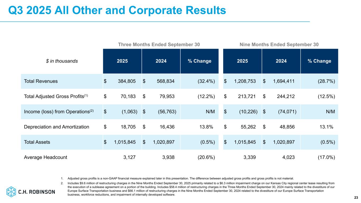 Q3 2025 Global Forwarding Results 22 1. Adjusted gross profits and adjusted gross profit margin % are non-GAAP financial measures explained later in this presentation. The difference between adjusted gross profits and gross profits is not material. 2. Includes $8.5 million of restructuring charges in the Three Months Ended September 30, 2025 and $11.1 million of restructuring charges in the Nine Months Ended September 30, 2025 mainly related to workforce reductions. Includes $1.3 million of restructuring charges in the Three Months Ended September 30, 2024 and $8.3 million of restructuring charges in the Nine Months Ended September 30, 2024 mainly related to workforce reductions. Three Months Ended September 30 Nine Months Ended September 30 $ in thousands 2025 2024 % Change 2025 2024 % Change Total Revenues $ 786,347 $ 1,141,190 (31.1) % $ 2,359,035 $ 2,921,050 (19.2) % Total Adjusted Gross Profits(1) $ 191,755 $ 234,636 (18.3) % $ 563,964 $ 598,748 (5.8) % Adjusted Gross Profit Margin % 24.4% 20.6% 380 bps 23.9% 20.5% 340 bps Income from Operations(2) $ 49,021 $ 88,115 (44.4) % $ 143,294 $ 160,649 (10.8) % Adjusted Operating Margin % 25.6% 37.6% (1,200 bps) 25.4% 26.8% (140 bps) Depreciation and Amortization $ 2,250 $ 2,608 (13.7) % $ 6,577 $ 8,245 (20.2) % Total Assets $ 1,233,692 $ 1,566,427 (21.2) % $ 1,233,692 $ 1,566,427 (21.2) % Average Headcount 4,245 4,552 (6.7) % 4,380 4,714 (7.1) %