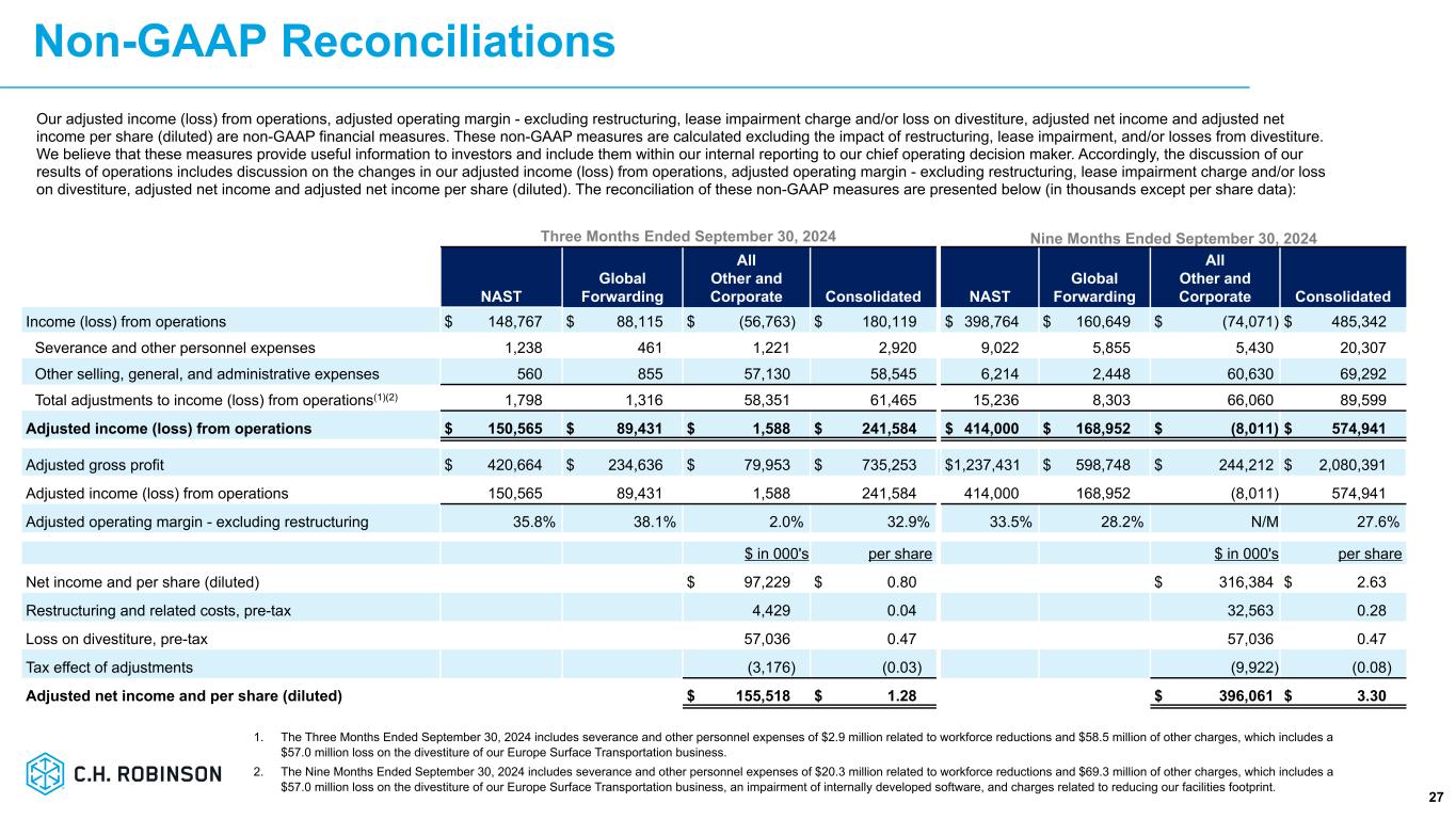 Non-GAAP Reconciliations 27 Our adjusted income (loss) from operations, adjusted operating margin - excluding restructuring, lease impairment charge and/or loss on divestiture, adjusted net income and adjusted net income per share (diluted) are non-GAAP financial measures. These non-GAAP measures are calculated excluding the impact of restructuring, lease impairment, and/or losses from divestiture. We believe that these measures provide useful information to investors and include them within our internal reporting to our chief operating decision maker. Accordingly, the discussion of our results of operations includes discussion on the changes in our adjusted income (loss) from operations, adjusted operating margin - excluding restructuring, lease impairment charge and/or loss on divestiture, adjusted net income and adjusted net income per share (diluted). The reconciliation of these non-GAAP measures are presented below (in thousands except per share data): Three Months Ended September 30, 2024 Nine Months Ended September 30, 2024 NAST Global Forwarding All Other and Corporate Consolidated NAST Global Forwarding All Other and Corporate Consolidated Income (loss) from operations $ 148,767 $ 88,115 $ (56,763) $ 180,119 $ 398,764 $ 160,649 $ (74,071) $ 485,342 Severance and other personnel expenses 1,238 461 1,221 2,920 9,022 5,855 5,430 20,307 Other selling, general, and administrative expenses 560 855 57,130 58,545 6,214 2,448 60,630 69,292 Total adjustments to income (loss) from operations(1)(2) 1,798 1,316 58,351 61,465 15,236 8,303 66,060 89,599 Adjusted income (loss) from operations $ 150,565 $ 89,431 $ 1,588 $ 241,584 $ 414,000 $ 168,952 $ (8,011) $ 574,941 Adjusted gross profit $ 420,664 $ 234,636 $ 79,953 $ 735,253 $ 1,237,431 $ 598,748 $ 244,212 $ 2,080,391 Adjusted income (loss) from operations 150,565 89,431 1,588 241,584 414,000 168,952 (8,011) 574,941 Adjusted operating margin - excluding restructuring 35.8% 38.1% 2.0% 32.9% 33.5% 28.2% N/M 27.6% $ in 000's per share $ in 000's per share Net income and per share (diluted) $ 97,229 $ 0.80 $ 316,384 $ 2.63 Restructuring and related costs, pre-tax 4,429 0.04 32,563 0.28 Loss on divestiture, pre-tax 57,036 0.47 57,036 0.47 Tax effect of adjustments (3,176) (0.03) (9,922) (0.08) Adjusted net income and per share (diluted) $ 155,518 $ 1.28 $ 396,061 $ 3.30 1. The Three Months Ended September 30, 2024 includes severance and other personnel expenses of $2.9 million related to workforce reductions and $58.5 million of other charges, which includes a $57.0 million loss on the divestiture of our Europe Surface Transportation business. 2. The Nine Months Ended September 30, 2024 includes severance and other personnel expenses of $20.3 million related to workforce reductions and $69.3 million of other charges, which includes a $57.0 million loss on the divestiture of our Europe Surface Transportation business, an impairment of internally developed software, and charges related to reducing our facilities footprint.