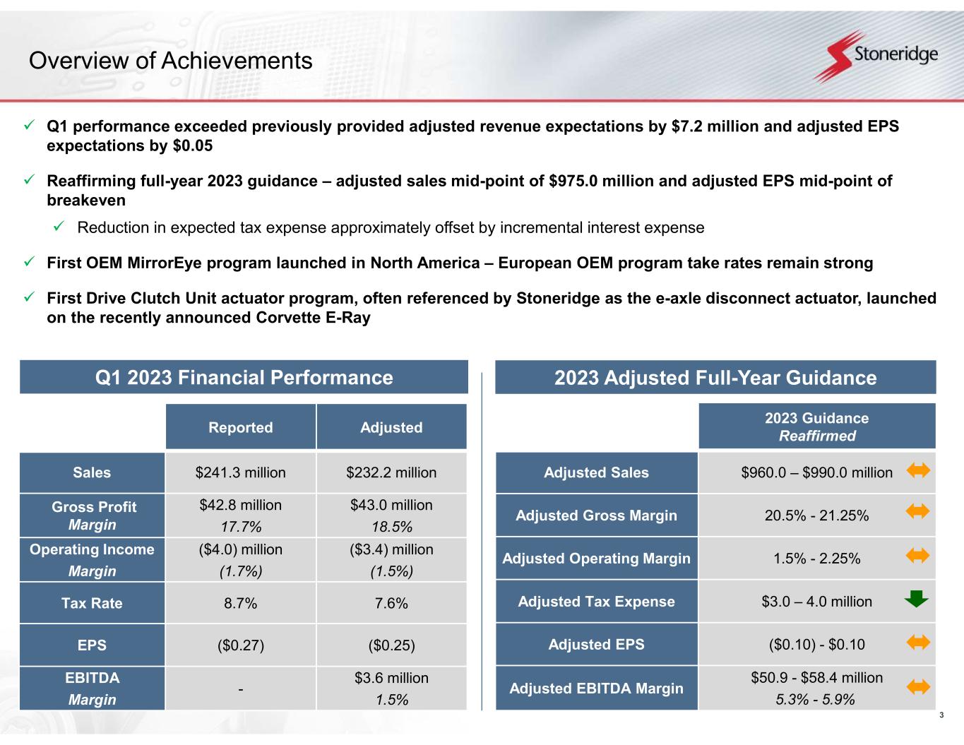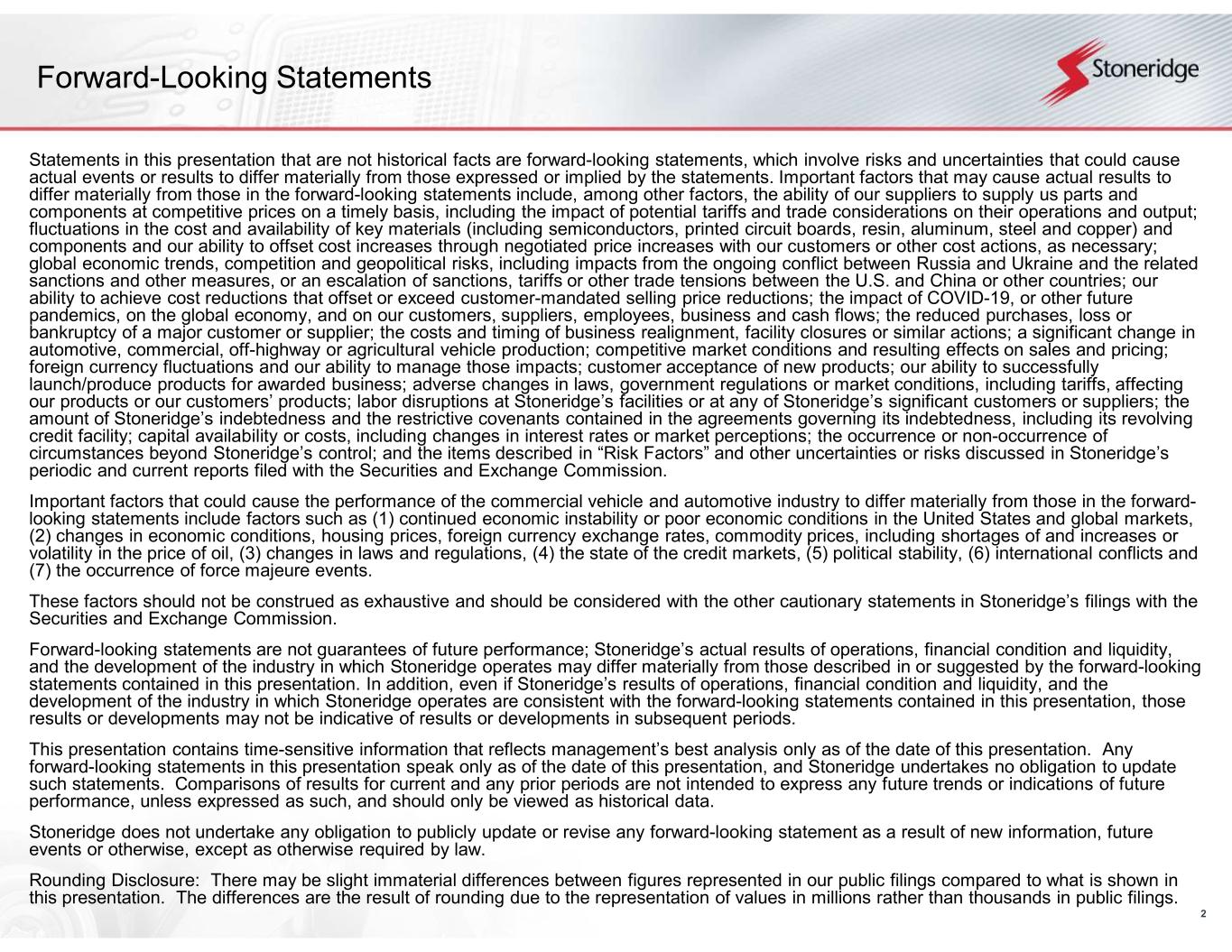 2 Forward-Looking Statements Statements in this presentation that are not historical facts are forward-looking statements, which involve risks and uncertainties that could cause actual events or results to differ materially from those expressed or implied by the statements. Important factors that may cause actual results to differ materially from those in the forward-looking statements include, among other factors, the ability of our suppliers to supply us parts and components at competitive prices on a timely basis, including the impact of potential tariffs and trade considerations on their operations and output; fluctuations in the cost and availability of key materials (including semiconductors, printed circuit boards, resin, aluminum, steel and copper) and components and our ability to offset cost increases through negotiated price increases with our customers or other cost actions, as necessary; global economic trends, competition and geopolitical risks, including impacts from the ongoing conflict between Russia and Ukraine and the related sanctions and other measures, or an escalation of sanctions, tariffs or other trade tensions between the U.S. and China or other countries; our ability to achieve cost reductions that offset or exceed customer-mandated selling price reductions; the impact of COVID-19, or other future pandemics, on the global economy, and on our customers, suppliers, employees, business and cash flows; the reduced purchases, loss or bankruptcy of a major customer or supplier; the costs and timing of business realignment, facility closures or similar actions; a significant change in automotive, commercial, off-highway or agricultural vehicle production; competitive market conditions and resulting effects on sales and pricing; foreign currency fluctuations and our ability to manage those impacts; customer acceptance of new products; our ability to successfully launch/produce products for awarded business; adverse changes in laws, government regulations or market conditions, including tariffs, affecting our products or our customers’ products; labor disruptions at Stoneridge’s facilities or at any of Stoneridge’s significant customers or suppliers; the amount of Stoneridge’s indebtedness and the restrictive covenants contained in the agreements governing its indebtedness, including its revolving credit facility; capital availability or costs, including changes in interest rates or market perceptions; the occurrence or non-occurrence of circumstances beyond Stoneridge’s control; and the items described in “Risk Factors” and other uncertainties or risks discussed in Stoneridge’s periodic and current reports filed with the Securities and Exchange Commission. Important factors that could cause the performance of the commercial vehicle and automotive industry to differ materially from those in the forward- looking statements include factors such as (1) continued economic instability or poor economic conditions in the United States and global markets, (2) changes in economic conditions, housing prices, foreign currency exchange rates, commodity prices, including shortages of and increases or volatility in the price of oil, (3) changes in laws and regulations, (4) the state of the credit markets, (5) political stability, (6) international conflicts and (7) the occurrence of force majeure events. These factors should not be construed as exhaustive and should be considered with the other cautionary statements in Stoneridge’s filings with the Securities and Exchange Commission. Forward-looking statements are not guarantees of future performance; Stoneridge’s actual results of operations, financial condition and liquidity, and the development of the industry in which Stoneridge operates may differ materially from those described in or suggested by the forward-looking statements contained in this presentation. In addition, even if Stoneridge’s results of operations, financial condition and liquidity, and the development of the industry in which Stoneridge operates are consistent with the forward-looking statements contained in this presentation, those results or developments may not be indicative of results or developments in subsequent periods. This presentation contains time-sensitive information that reflects management’s best analysis only as of the date of this presentation. Any forward-looking statements in this presentation speak only as of the date of this presentation, and Stoneridge undertakes no obligation to update such statements. Comparisons of results for current and any prior periods are not intended to express any future trends or indications of future performance, unless expressed as such, and should only be viewed as historical data. Stoneridge does not undertake any obligation to publicly update or revise any forward-looking statement as a result of new information, future events or otherwise, except as otherwise required by law. Rounding Disclosure: There may be slight immaterial differences between figures represented in our public filings compared to what is shown in this presentation. The differences are the result of rounding due to the representation of values in millions rather than thousands in public filings.