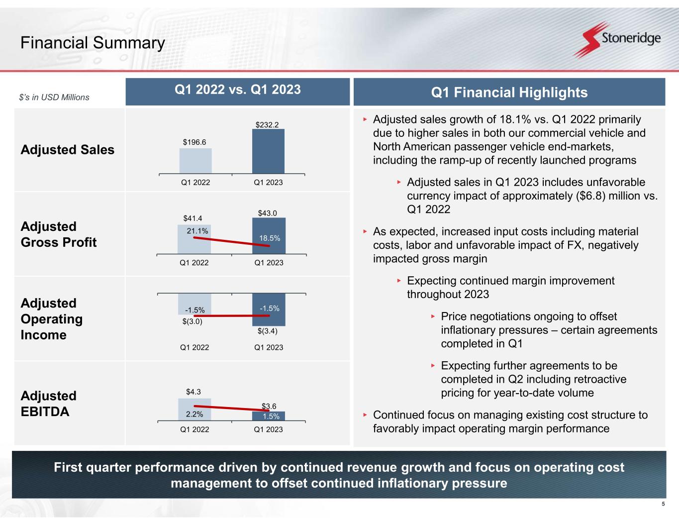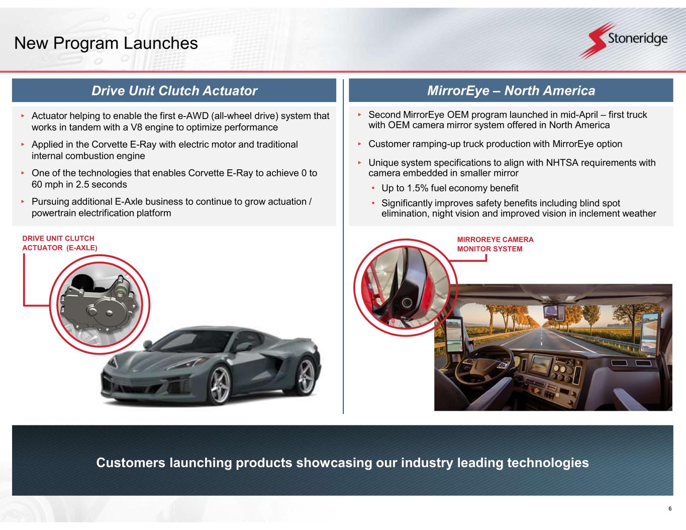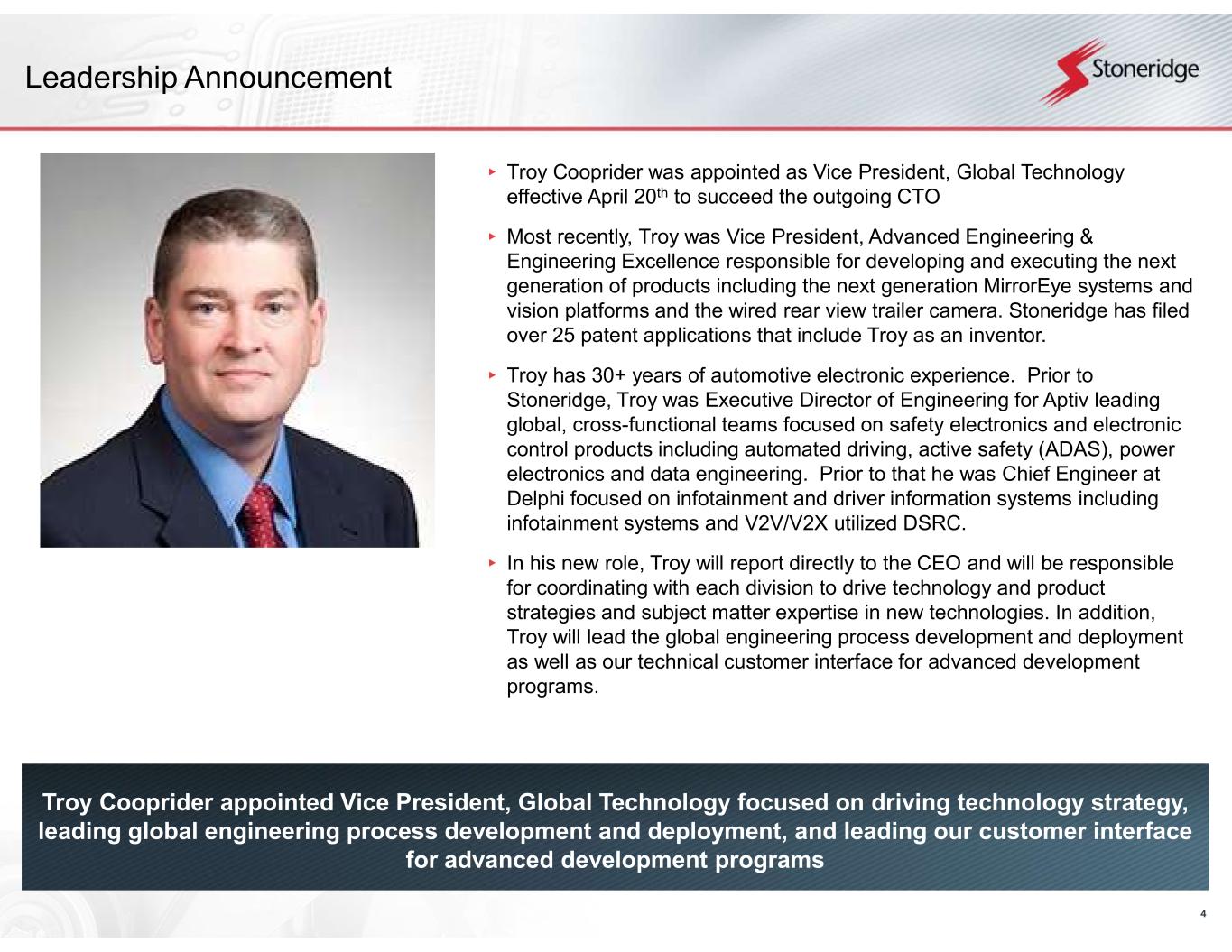 4 Leadership Announcement Troy Cooprider appointed Vice President, Global Technology focused on driving technology strategy, leading global engineering process development and deployment, and leading our customer interface for advanced development programs ▸ Troy Cooprider was appointed as Vice President, Global Technology effective April 20th to succeed the outgoing CTO ▸ Most recently, Troy was Vice President, Advanced Engineering & Engineering Excellence responsible for developing and executing the next generation of products including the next generation MirrorEye systems and vision platforms and the wired rear view trailer camera. Stoneridge has filed over 25 patent applications that include Troy as an inventor. ▸ Troy has 30+ years of automotive electronic experience. Prior to Stoneridge, Troy was Executive Director of Engineering for Aptiv leading global, cross-functional teams focused on safety electronics and electronic control products including automated driving, active safety (ADAS), power electronics and data engineering. Prior to that he was Chief Engineer at Delphi focused on infotainment and driver information systems including infotainment systems and V2V/V2X utilized DSRC. ▸ In his new role, Troy will report directly to the CEO and will be responsible for coordinating with each division to drive technology and product strategies and subject matter expertise in new technologies. In addition, Troy will lead the global engineering process development and deployment as well as our technical customer interface for advanced development programs.