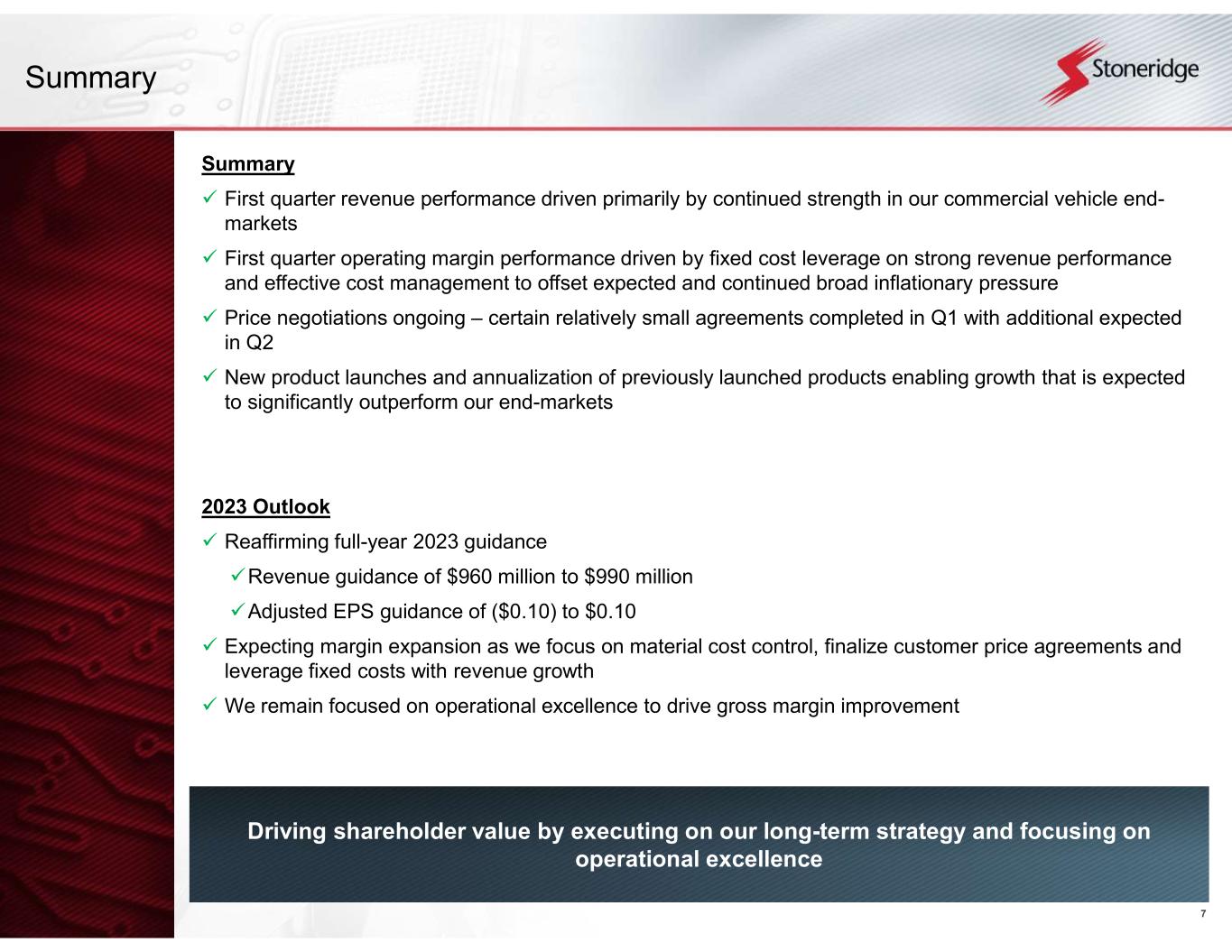 6 New Program Launches Customers launching products showcasing our industry leading technologies DRIVE UNIT CLUTCH ACTUATOR (E-AXLE) ▸ Actuator helping to enable the first e-AWD (all-wheel drive) system that works in tandem with a V8 engine to optimize performance ▸ Applied in the Corvette E-Ray with electric motor and traditional internal combustion engine ▸ One of the technologies that enables Corvette E-Ray to achieve 0 to 60 mph in 2.5 seconds ▸ Pursuing additional E-Axle business to continue to grow actuation / powertrain electrification platform Drive Unit Clutch Actuator ▸ Second MirrorEye OEM program launched in mid-April – first truck with OEM camera mirror system offered in North America ▸ Customer ramping-up truck production with MirrorEye option ▸ Unique system specifications to align with NHTSA requirements with camera embedded in smaller mirror • Up to 1.5% fuel economy benefit • Significantly improves safety benefits including blind spot elimination, night vision and improved vision in inclement weather MirrorEye – North America MIRROREYE CAMERA MONITOR SYSTEM