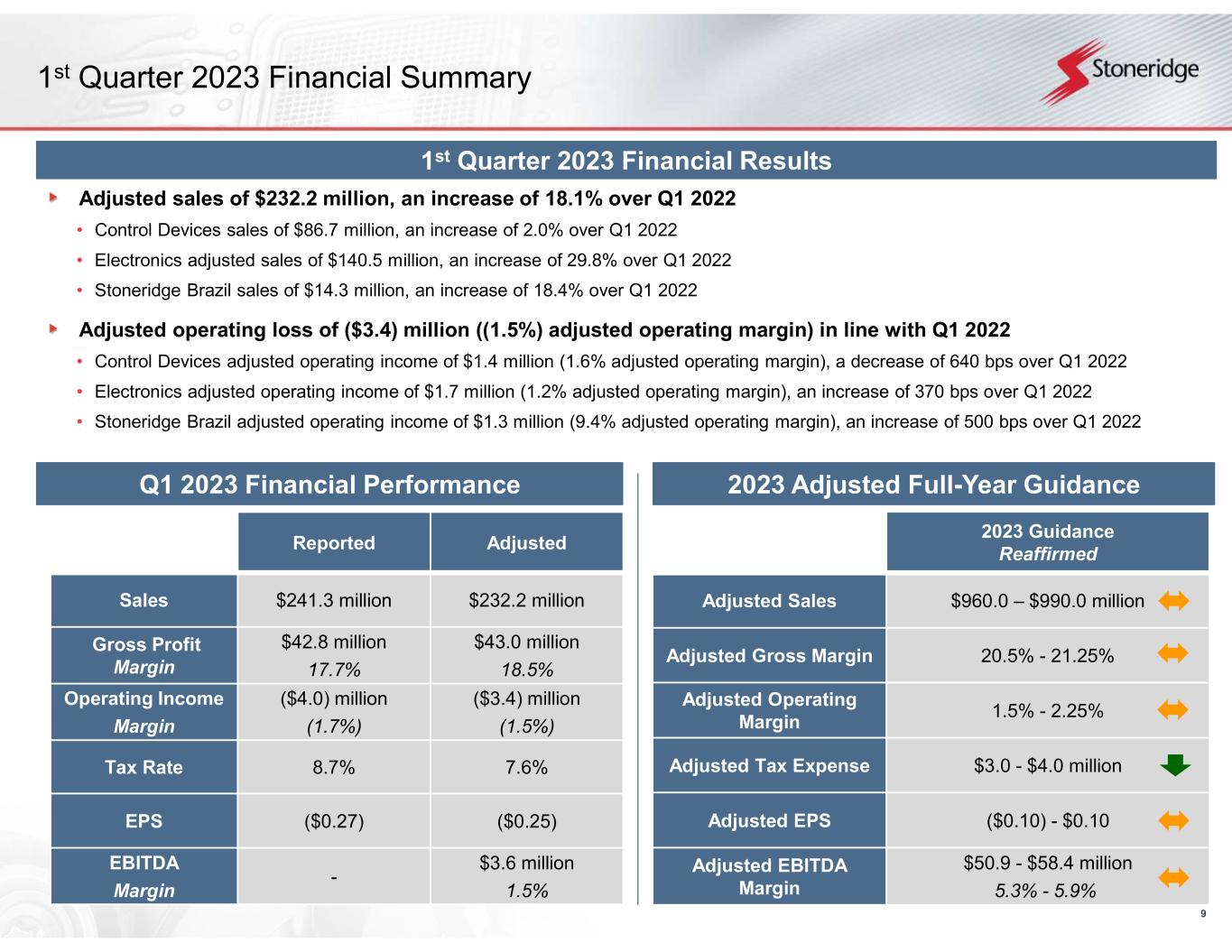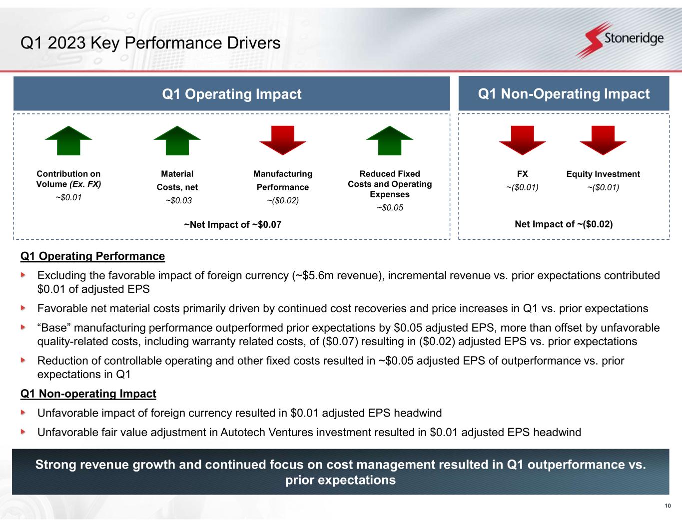 9 1st Quarter 2023 Financial Summary 1st Quarter 2023 Financial Results Adjusted sales of $232.2 million, an increase of 18.1% over Q1 2022 • Control Devices sales of $86.7 million, an increase of 2.0% over Q1 2022 • Electronics adjusted sales of $140.5 million, an increase of 29.8% over Q1 2022 • Stoneridge Brazil sales of $14.3 million, an increase of 18.4% over Q1 2022 Adjusted operating loss of ($3.4) million ((1.5%) adjusted operating margin) in line with Q1 2022 • Control Devices adjusted operating income of $1.4 million (1.6% adjusted operating margin), a decrease of 640 bps over Q1 2022 • Electronics adjusted operating income of $1.7 million (1.2% adjusted operating margin), an increase of 370 bps over Q1 2022 • Stoneridge Brazil adjusted operating income of $1.3 million (9.4% adjusted operating margin), an increase of 500 bps over Q1 2022 Q1 2023 Financial Performance 2023 Adjusted Full-Year Guidance 2023 Guidance Reaffirmed $960.0 – $990.0 millionAdjusted Sales 20.5% - 21.25%Adjusted Gross Margin 1.5% - 2.25% Adjusted Operating Margin $3.0 - $4.0 millionAdjusted Tax Expense ($0.10) - $0.10Adjusted EPS $50.9 - $58.4 million 5.3% - 5.9% Adjusted EBITDA Margin AdjustedReported $232.2 million$241.3 millionSales $43.0 million 18.5% $42.8 million 17.7% Gross Profit Margin ($3.4) million (1.5%) ($4.0) million (1.7%) Operating Income Margin 7.6%8.7%Tax Rate ($0.25)($0.27)EPS $3.6 million 1.5% - EBITDA Margin