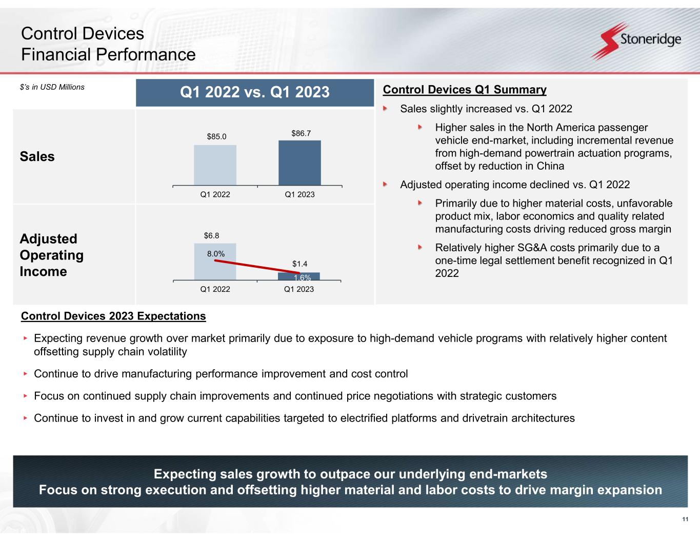 10 Q1 2023 Key Performance Drivers Strong revenue growth and continued focus on cost management resulted in Q1 outperformance vs. prior expectations Q1 Operating Performance Excluding the favorable impact of foreign currency (~$5.6m revenue), incremental revenue vs. prior expectations contributed $0.01 of adjusted EPS Favorable net material costs primarily driven by continued cost recoveries and price increases in Q1 vs. prior expectations “Base” manufacturing performance outperformed prior expectations by $0.05 adjusted EPS, more than offset by unfavorable quality-related costs, including warranty related costs, of ($0.07) resulting in ($0.02) adjusted EPS vs. prior expectations Reduction of controllable operating and other fixed costs resulted in ~$0.05 adjusted EPS of outperformance vs. prior expectations in Q1 Q1 Non-operating Impact Unfavorable impact of foreign currency resulted in $0.01 adjusted EPS headwind Unfavorable fair value adjustment in Autotech Ventures investment resulted in $0.01 adjusted EPS headwind Reduced Fixed Costs and Operating Expenses ~$0.05 ~Net Impact of ~$0.07 Net Impact of ~($0.02) Q1 Operating Impact Q1 Non-Operating Impact Contribution on Volume (Ex. FX) ~$0.01 FX ~($0.01) Material Costs, net ~$0.03 Manufacturing Performance ~($0.02) Equity Investment ~($0.01)