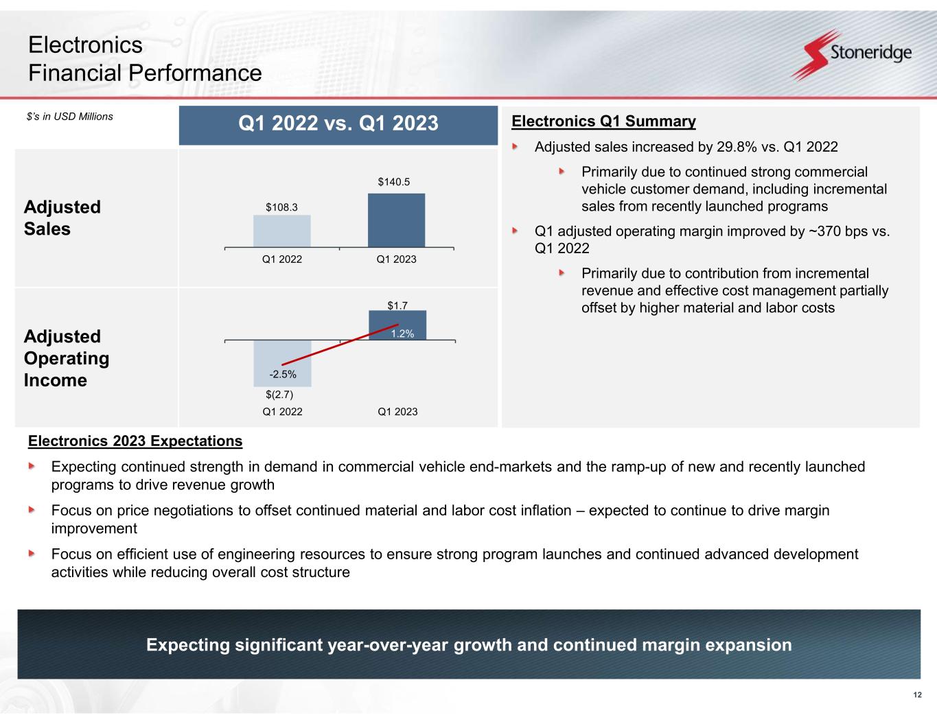 11 Control Devices Financial Performance Expecting sales growth to outpace our underlying end-markets Focus on strong execution and offsetting higher material and labor costs to drive margin expansion Control Devices 2023 Expectations ▸ Expecting revenue growth over market primarily due to exposure to high-demand vehicle programs with relatively higher content offsetting supply chain volatility ▸ Continue to drive manufacturing performance improvement and cost control ▸ Focus on continued supply chain improvements and continued price negotiations with strategic customers ▸ Continue to invest in and grow current capabilities targeted to electrified platforms and drivetrain architectures Q1 2022 vs. Q1 2023 Sales Adjusted Operating Income $’s in USD Millions Control Devices Q1 Summary Sales slightly increased vs. Q1 2022 Higher sales in the North America passenger vehicle end-market, including incremental revenue from high-demand powertrain actuation programs, offset by reduction in China Adjusted operating income declined vs. Q1 2022 Primarily due to higher material costs, unfavorable product mix, labor economics and quality related manufacturing costs driving reduced gross margin Relatively higher SG&A costs primarily due to a one-time legal settlement benefit recognized in Q1 2022 $85.0 $86.7 Q1 2022 Q1 2023 $6.8 $1.4 8.0% 1.6% -2% 8% 18% 0 2 4 6 8 Q1 2022 Q1 2023