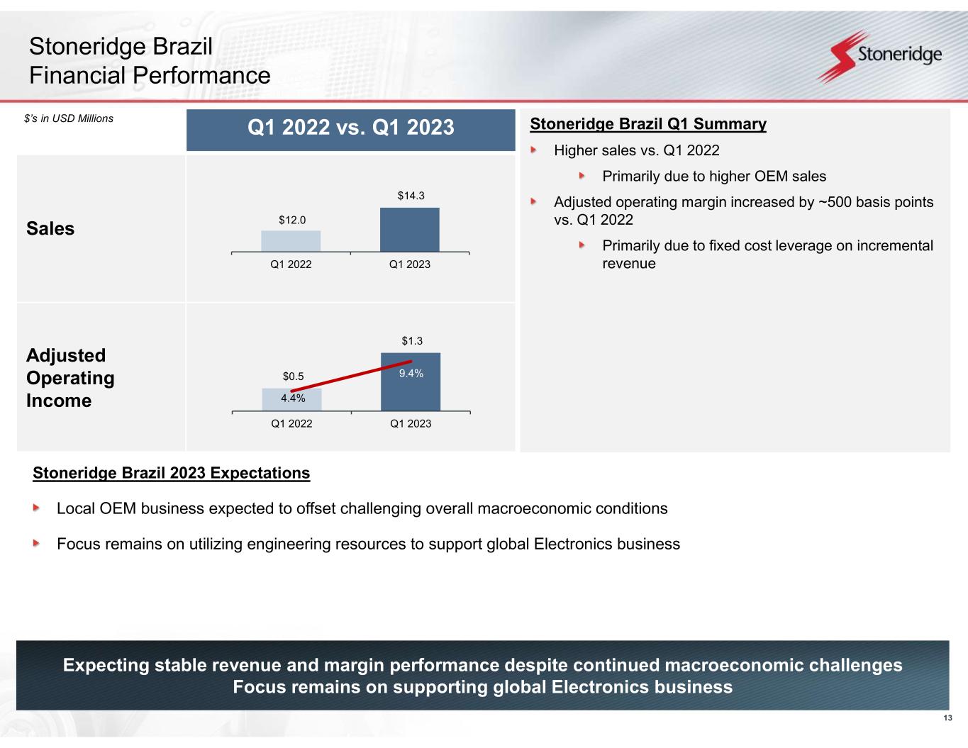 12 Electronics Financial Performance Expecting significant year-over-year growth and continued margin expansion Electronics 2023 Expectations Expecting continued strength in demand in commercial vehicle end-markets and the ramp-up of new and recently launched programs to drive revenue growth Focus on price negotiations to offset continued material and labor cost inflation – expected to continue to drive margin improvement Focus on efficient use of engineering resources to ensure strong program launches and continued advanced development activities while reducing overall cost structure Q1 2022 vs. Q1 2023 Adjusted Sales Adjusted Operating Income $’s in USD Millions Electronics Q1 Summary Adjusted sales increased by 29.8% vs. Q1 2022 Primarily due to continued strong commercial vehicle customer demand, including incremental sales from recently launched programs Q1 adjusted operating margin improved by ~370 bps vs. Q1 2022 Primarily due to contribution from incremental revenue and effective cost management partially offset by higher material and labor costs $108.3 $140.5 Q1 2022 Q1 2023 $(2.7) $1.7 -2.5% 1.2% -5% -3% -1% 1% 3% -3 -2 -1 0 1 2 Q1 2022 Q1 2023