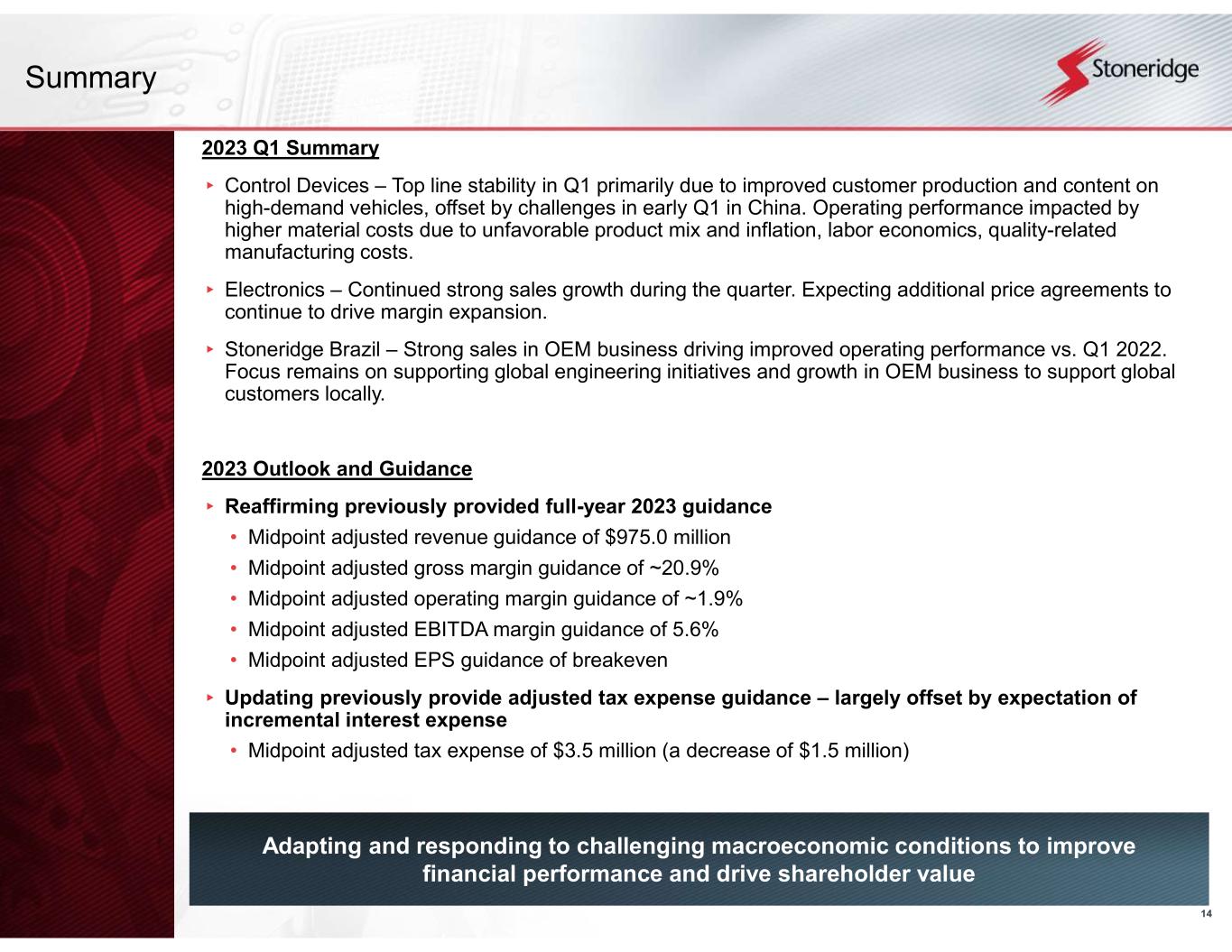 13 Stoneridge Brazil Financial Performance Expecting stable revenue and margin performance despite continued macroeconomic challenges Focus remains on supporting global Electronics business Stoneridge Brazil 2023 Expectations Local OEM business expected to offset challenging overall macroeconomic conditions Focus remains on utilizing engineering resources to support global Electronics business Stoneridge Brazil Q1 Summary Higher sales vs. Q1 2022 Primarily due to higher OEM sales Adjusted operating margin increased by ~500 basis points vs. Q1 2022 Primarily due to fixed cost leverage on incremental revenue $’s in USD Millions Q1 2022 vs. Q1 2023 Sales Adjusted Operating Income $’s in USD Millions $12.0 $14.3 Q1 2022 Q1 2023 $0.5 $1.3 4.4% 9.4% 1% 6% 11% Q1 2022 Q1 2023