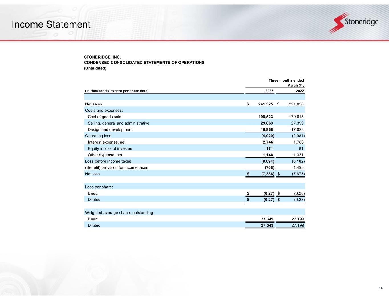 16 Income Statement STONERIDGE, INC. CONDENSED CONSOLIDATED STATEMENTS OF OPERATIONS (Unaudited) Three months ended March 31, (in thousands, except per share data) 2023 2022 Net sales $ 241,325 $ 221,058 Costs and expenses: Cost of goods sold 198,523 179,615 Selling, general and administrative 29,863 27,399 Design and development 16,968 17,028 Operating loss (4,029) (2,984) Interest expense, net 2,746 1,786 Equity in loss of investee 171 81 Other expense, net 1,148 1,331 Loss before income taxes (8,094) (6,182) (Benefit) provision for income taxes (708) 1,493 Net loss $ (7,386) $ (7,675) Loss per share: Basic $ (0.27) $ (0.28) Diluted $ (0.27) $ (0.28) Weighted-average shares outstanding: Basic 27,349 27,199 Diluted 27,349 27,199