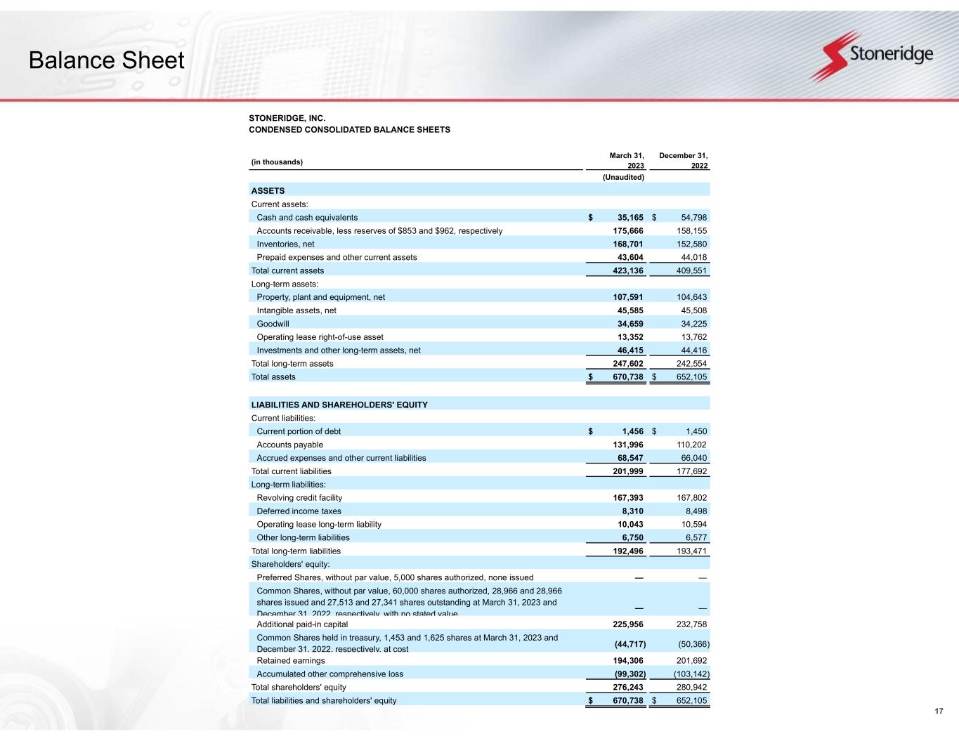 17 Balance Sheet STONERIDGE, INC. CONDENSED CONSOLIDATED BALANCE SHEETS (in thousands) March 31, 2023 December 31, 2022 (Unaudited) ASSETS Current assets: Cash and cash equivalents $ 35,165 $ 54,798 Accounts receivable, less reserves of $853 and $962, respectively 175,666 158,155 Inventories, net 168,701 152,580 Prepaid expenses and other current assets 43,604 44,018 Total current assets 423,136 409,551 Long-term assets: Property, plant and equipment, net 107,591 104,643 Intangible assets, net 45,585 45,508 Goodwill 34,659 34,225 Operating lease right-of-use asset 13,352 13,762 Investments and other long-term assets, net 46,415 44,416 Total long-term assets 247,602 242,554 Total assets $ 670,738 $ 652,105 LIABILITIES AND SHAREHOLDERS' EQUITY Current liabilities: Current portion of debt $ 1,456 $ 1,450 Accounts payable 131,996 110,202 Accrued expenses and other current liabilities 68,547 66,040 Total current liabilities 201,999 177,692 Long-term liabilities: Revolving credit facility 167,393 167,802 Deferred income taxes 8,310 8,498 Operating lease long-term liability 10,043 10,594 Other long-term liabilities 6,750 6,577 Total long-term liabilities 192,496 193,471 Shareholders' equity: Preferred Shares, without par value, 5,000 shares authorized, none issued — — Common Shares, without par value, 60,000 shares authorized, 28,966 and 28,966 shares issued and 27,513 and 27,341 shares outstanding at March 31, 2023 and December 31, 2022, respectively, with no stated value — — Additional paid-in capital 225,956 232,758 Common Shares held in treasury, 1,453 and 1,625 shares at March 31, 2023 and December 31, 2022, respectively, at cost (44,717) (50,366) Retained earnings 194,306 201,692 Accumulated other comprehensive loss (99,302) (103,142) Total shareholders' equity 276,243 280,942 Total liabilities and shareholders' equity $ 670,738 $ 652,105