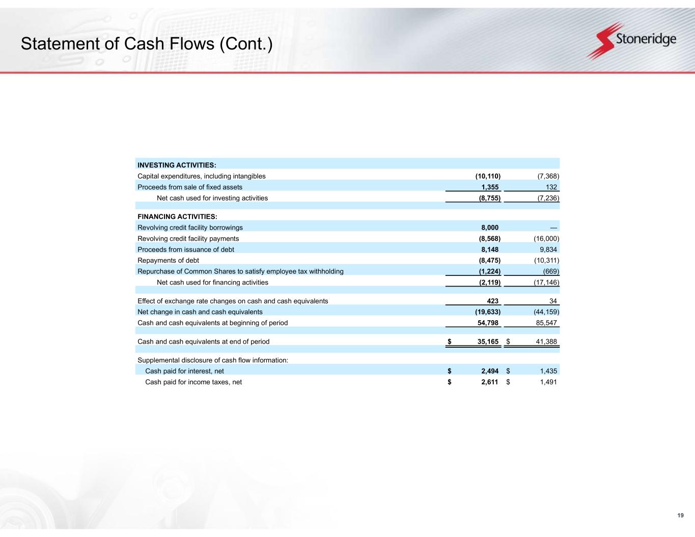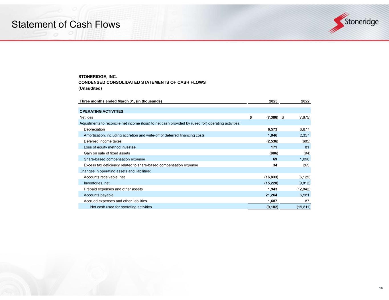 18 Statement of Cash Flows STONERIDGE, INC. CONDENSED CONSOLIDATED STATEMENTS OF CASH FLOWS (Unaudited) Three months ended March 31, (in thousands) 2023 2022 OPERATING ACTIVITIES: Net loss $ (7,386) $ (7,675) Adjustments to reconcile net income (loss) to net cash provided by (used for) operating activities: Depreciation 6,573 6,877 Amortization, including accretion and write-off of deferred financing costs 1,946 2,357 Deferred income taxes (2,536) (605) Loss of equity method investee 171 81 Gain on sale of fixed assets (886) (94) Share-based compensation expense 69 1,098 Excess tax deficiency related to share-based compensation expense 34 265 Changes in operating assets and liabilities: Accounts receivable, net (16,833) (6,129) Inventories, net (15,228) (9,812) Prepaid expenses and other assets 1,943 (12,842) Accounts payable 21,264 6,581 Accrued expenses and other liabilities 1,687 87 Net cash used for operating activities (9,182) (19,811)