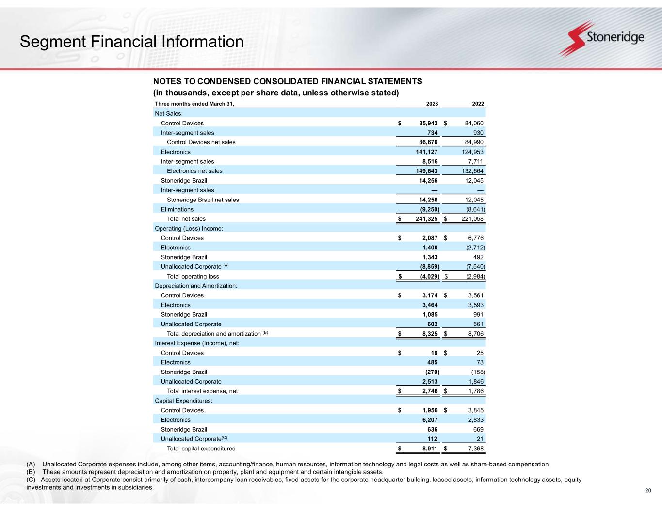 20 Segment Financial Information (A) Unallocated Corporate expenses include, among other items, accounting/finance, human resources, information technology and legal costs as well as share-based compensation (B) These amounts represent depreciation and amortization on property, plant and equipment and certain intangible assets. (C) Assets located at Corporate consist primarily of cash, intercompany loan receivables, fixed assets for the corporate headquarter building, leased assets, information technology assets, equity investments and investments in subsidiaries. NOTES TO CONDENSED CONSOLIDATED FINANCIAL STATEMENTS (in thousands, except per share data, unless otherwise stated) Three months ended March 31, 2023 2022 Net Sales: Control Devices $ 85,942 $ 84,060 Inter-segment sales 734 930 Control Devices net sales 86,676 84,990 Electronics 141,127 124,953 Inter-segment sales 8,516 7,711 Electronics net sales 149,643 132,664 Stoneridge Brazil 14,256 12,045 Inter-segment sales — — Stoneridge Brazil net sales 14,256 12,045 Eliminations (9,250) (8,641) Total net sales $ 241,325 $ 221,058 Operating (Loss) Income: Control Devices $ 2,087 $ 6,776 Electronics 1,400 (2,712) Stoneridge Brazil 1,343 492 Unallocated Corporate (A) (8,859) (7,540) Total operating loss $ (4,029) $ (2,984) Depreciation and Amortization: Control Devices $ 3,174 $ 3,561 Electronics 3,464 3,593 Stoneridge Brazil 1,085 991 Unallocated Corporate 602 561 Total depreciation and amortization (B) $ 8,325 $ 8,706 Interest Expense (Income), net: Control Devices $ 18 $ 25 Electronics 485 73 Stoneridge Brazil (270) (158) Unallocated Corporate 2,513 1,846 Total interest expense, net $ 2,746 $ 1,786 Capital Expenditures: Control Devices $ 1,956 $ 3,845 Electronics 6,207 2,833 Stoneridge Brazil 636 669 Unallocated Corporate(C) 112 21 Total capital expenditures $ 8,911 $ 7,368