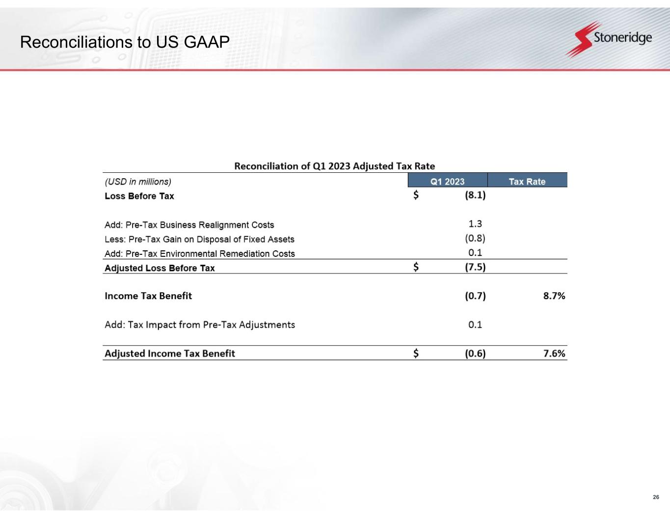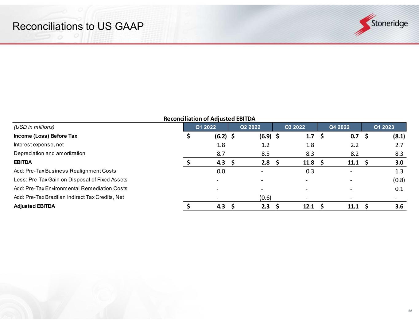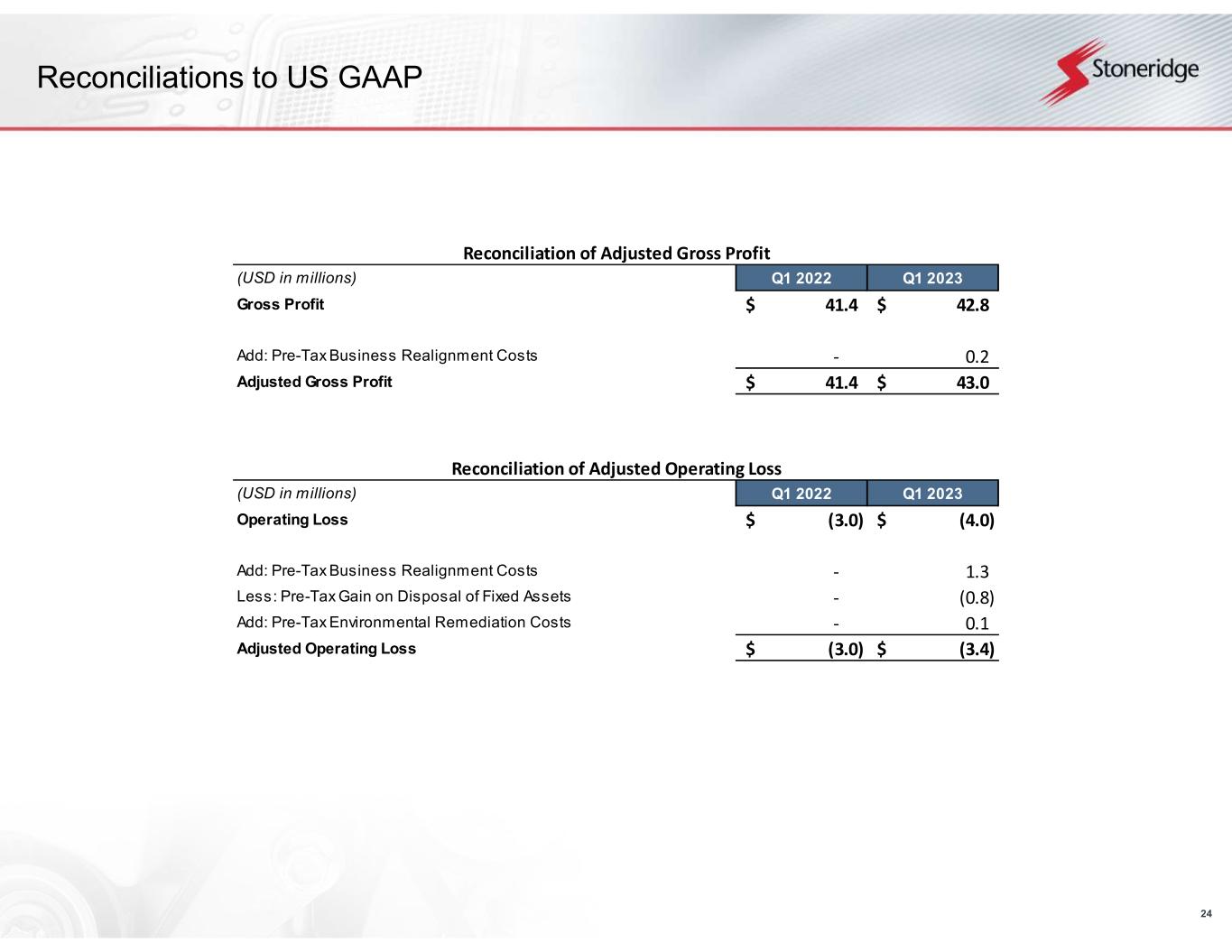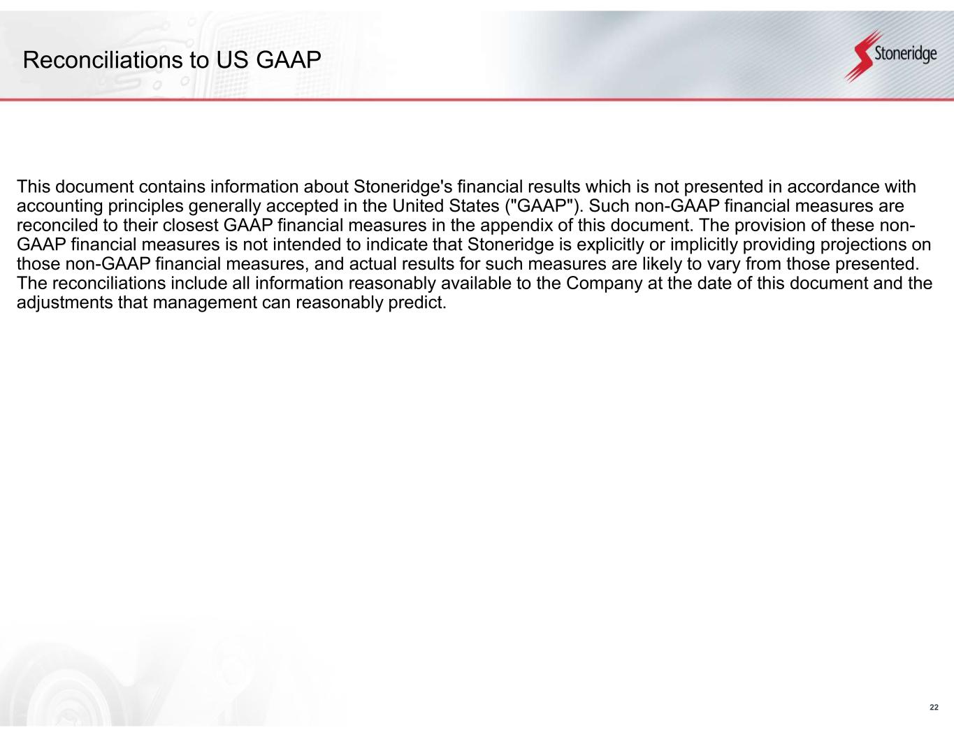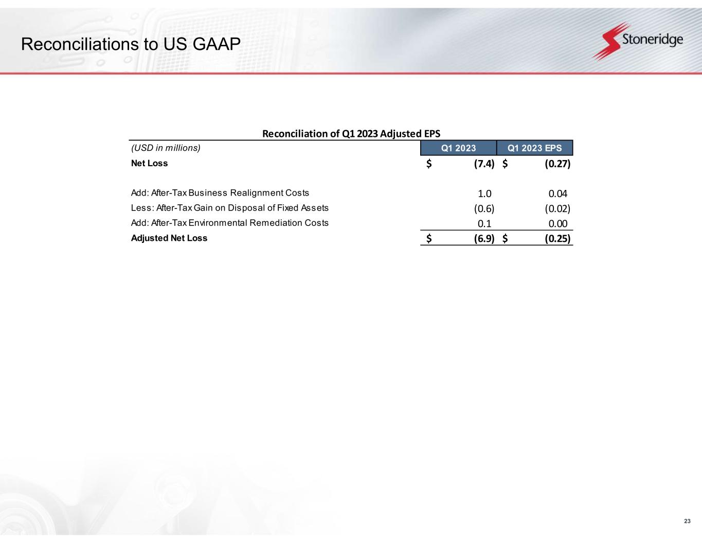 22 Reconciliations to US GAAP This document contains information about Stoneridge's financial results which is not presented in accordance with accounting principles generally accepted in the United States ("GAAP"). Such non-GAAP financial measures are reconciled to their closest GAAP financial measures in the appendix of this document. The provision of these non- GAAP financial measures is not intended to indicate that Stoneridge is explicitly or implicitly providing projections on those non-GAAP financial measures, and actual results for such measures are likely to vary from those presented. The reconciliations include all information reasonably available to the Company at the date of this document and the adjustments that management can reasonably predict.