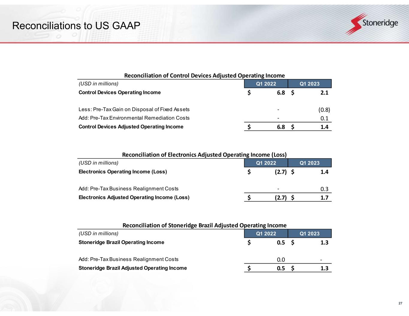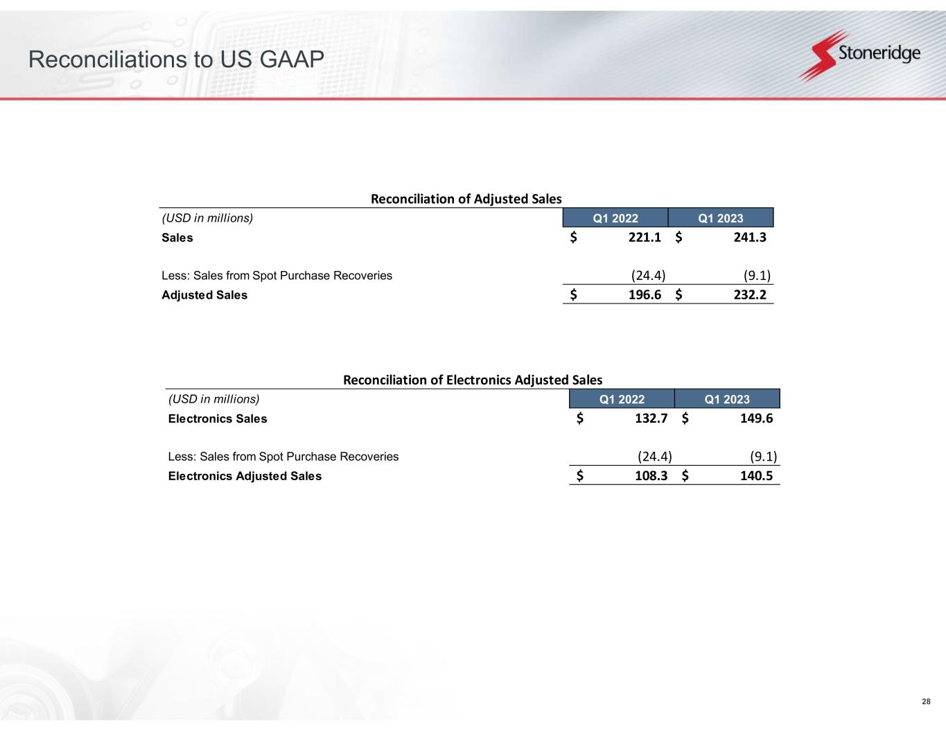 27 Reconciliations to US GAAP Reconciliation of Electronics Adjusted Operating Income (Loss) (USD in millions) Q1 2022 Q1 2023 Electronics Operating Income (Loss) (2.7)$ 1.4$ Add: Pre-Tax Business Realignment Costs - 0.3 Electronics Adjusted Operating Income (Loss) (2.7)$ 1.7$ Reconciliation of Control Devices Adjusted Operating Income (USD in millions) Q1 2022 Q1 2023 Control Devices Operating Income 6.8$ 2.1$ Less: Pre-Tax Gain on Disposal of Fixed Assets - (0.8) Add: Pre-Tax Environmental Remediation Costs - 0.1 Control Devices Adjusted Operating Income 6.8$ 1.4$ Reconciliation of Stoneridge Brazil Adjusted Operating Income (USD in millions) Q1 2022 Q1 2023 Stoneridge Brazil Operating Income 0.5$ 1.3$ Add: Pre-Tax Business Realignment Costs 0.0 - Stoneridge Brazil Adjusted Operating Income 0.5$ 1.3$