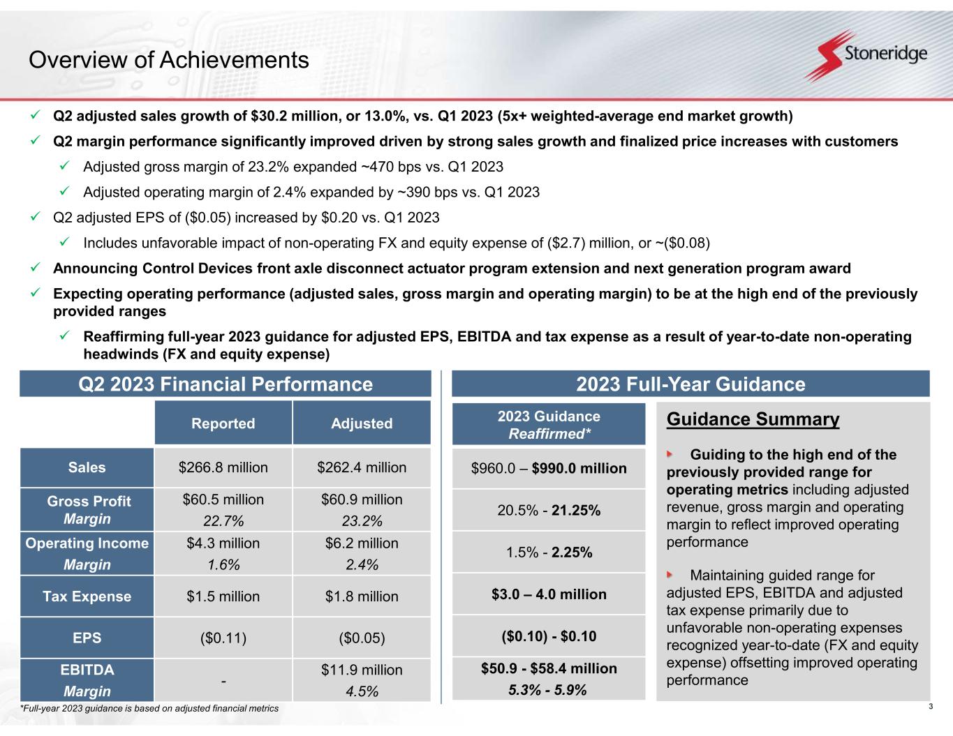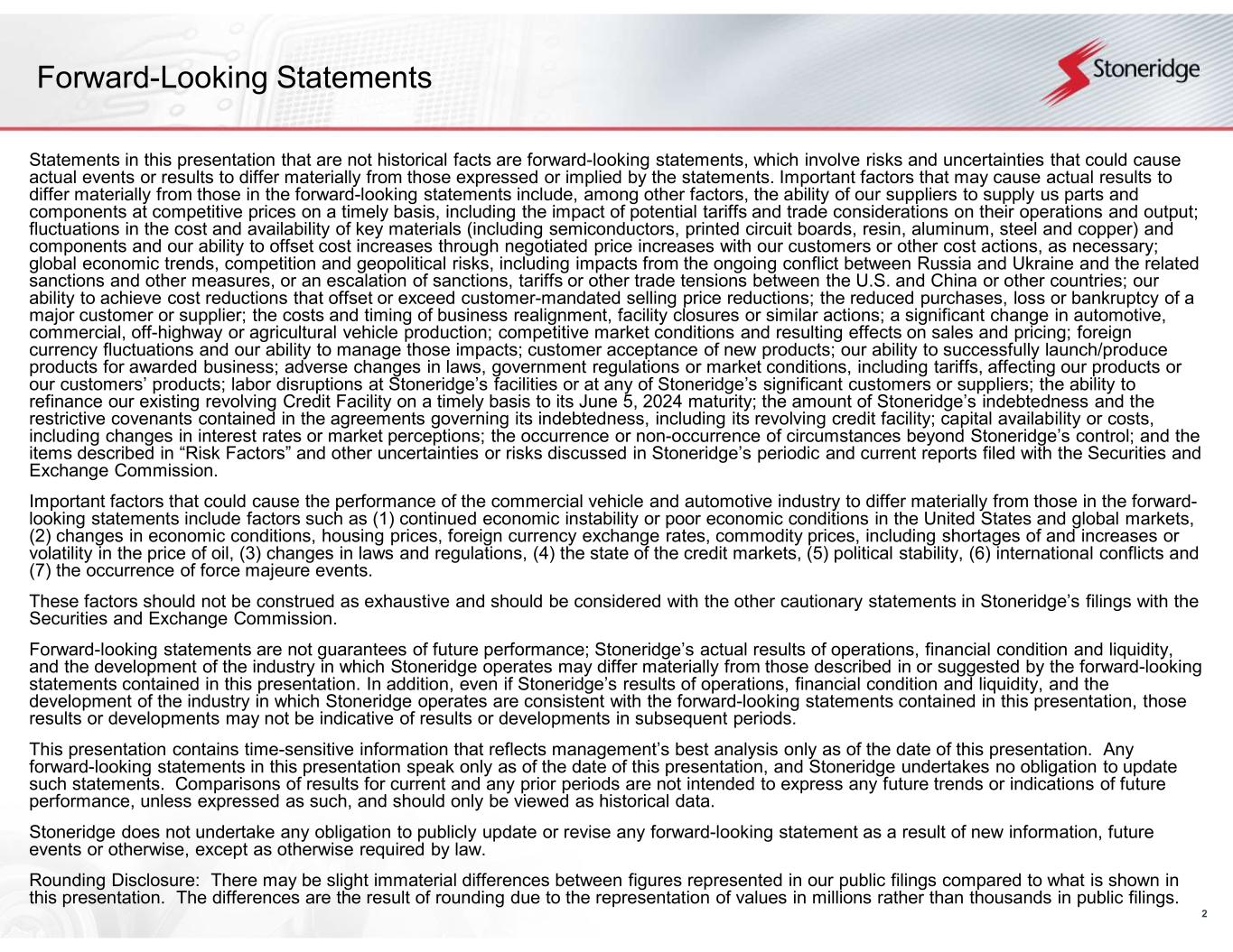 2 Forward-Looking Statements Statements in this presentation that are not historical facts are forward-looking statements, which involve risks and uncertainties that could cause actual events or results to differ materially from those expressed or implied by the statements. Important factors that may cause actual results to differ materially from those in the forward-looking statements include, among other factors, the ability of our suppliers to supply us parts and components at competitive prices on a timely basis, including the impact of potential tariffs and trade considerations on their operations and output; fluctuations in the cost and availability of key materials (including semiconductors, printed circuit boards, resin, aluminum, steel and copper) and components and our ability to offset cost increases through negotiated price increases with our customers or other cost actions, as necessary; global economic trends, competition and geopolitical risks, including impacts from the ongoing conflict between Russia and Ukraine and the related sanctions and other measures, or an escalation of sanctions, tariffs or other trade tensions between the U.S. and China or other countries; our ability to achieve cost reductions that offset or exceed customer-mandated selling price reductions; the reduced purchases, loss or bankruptcy of a major customer or supplier; the costs and timing of business realignment, facility closures or similar actions; a significant change in automotive, commercial, off-highway or agricultural vehicle production; competitive market conditions and resulting effects on sales and pricing; foreign currency fluctuations and our ability to manage those impacts; customer acceptance of new products; our ability to successfully launch/produce products for awarded business; adverse changes in laws, government regulations or market conditions, including tariffs, affecting our products or our customers’ products; labor disruptions at Stoneridge’s facilities or at any of Stoneridge’s significant customers or suppliers; the ability to refinance our existing revolving Credit Facility on a timely basis to its June 5, 2024 maturity; the amount of Stoneridge’s indebtedness and the restrictive covenants contained in the agreements governing its indebtedness, including its revolving credit facility; capital availability or costs, including changes in interest rates or market perceptions; the occurrence or non-occurrence of circumstances beyond Stoneridge’s control; and the items described in “Risk Factors” and other uncertainties or risks discussed in Stoneridge’s periodic and current reports filed with the Securities and Exchange Commission. Important factors that could cause the performance of the commercial vehicle and automotive industry to differ materially from those in the forward- looking statements include factors such as (1) continued economic instability or poor economic conditions in the United States and global markets, (2) changes in economic conditions, housing prices, foreign currency exchange rates, commodity prices, including shortages of and increases or volatility in the price of oil, (3) changes in laws and regulations, (4) the state of the credit markets, (5) political stability, (6) international conflicts and (7) the occurrence of force majeure events. These factors should not be construed as exhaustive and should be considered with the other cautionary statements in Stoneridge’s filings with the Securities and Exchange Commission. Forward-looking statements are not guarantees of future performance; Stoneridge’s actual results of operations, financial condition and liquidity, and the development of the industry in which Stoneridge operates may differ materially from those described in or suggested by the forward-looking statements contained in this presentation. In addition, even if Stoneridge’s results of operations, financial condition and liquidity, and the development of the industry in which Stoneridge operates are consistent with the forward-looking statements contained in this presentation, those results or developments may not be indicative of results or developments in subsequent periods. This presentation contains time-sensitive information that reflects management’s best analysis only as of the date of this presentation. Any forward-looking statements in this presentation speak only as of the date of this presentation, and Stoneridge undertakes no obligation to update such statements. Comparisons of results for current and any prior periods are not intended to express any future trends or indications of future performance, unless expressed as such, and should only be viewed as historical data. Stoneridge does not undertake any obligation to publicly update or revise any forward-looking statement as a result of new information, future events or otherwise, except as otherwise required by law. Rounding Disclosure: There may be slight immaterial differences between figures represented in our public filings compared to what is shown in this presentation. The differences are the result of rounding due to the representation of values in millions rather than thousands in public filings.