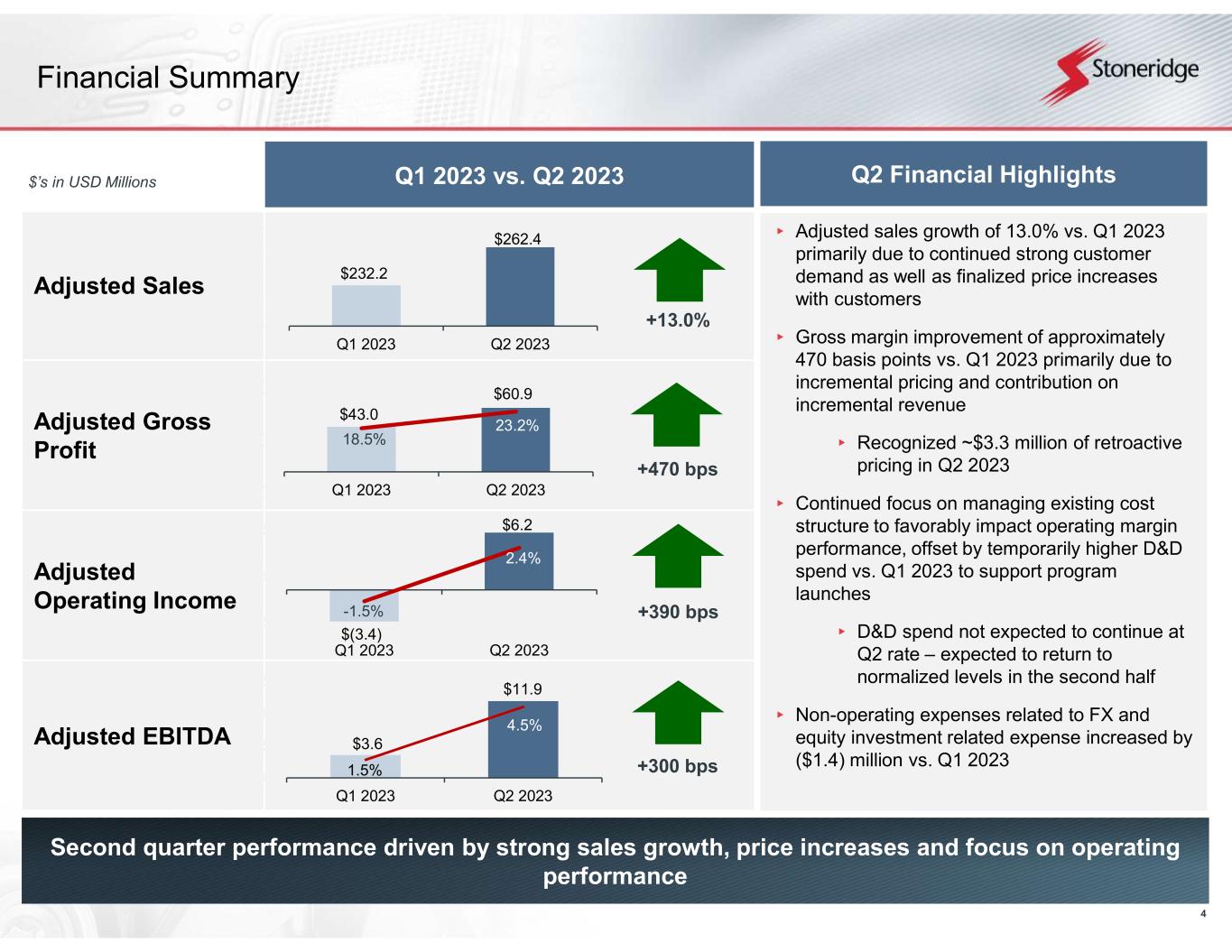 3 2023 Guidance Reaffirmed* $960.0 – $990.0 million 20.5% - 21.25% 1.5% - 2.25% $3.0 – 4.0 million ($0.10) - $0.10 $50.9 - $58.4 million 5.3% - 5.9% Overview of Achievements  Q2 adjusted sales growth of $30.2 million, or 13.0%, vs. Q1 2023 (5x+ weighted-average end market growth)  Q2 margin performance significantly improved driven by strong sales growth and finalized price increases with customers  Adjusted gross margin of 23.2% expanded ~470 bps vs. Q1 2023  Adjusted operating margin of 2.4% expanded by ~390 bps vs. Q1 2023  Q2 adjusted EPS of ($0.05) increased by $0.20 vs. Q1 2023  Includes unfavorable impact of non-operating FX and equity expense of ($2.7) million, or ~($0.08)  Announcing Control Devices front axle disconnect actuator program extension and next generation program award  Expecting operating performance (adjusted sales, gross margin and operating margin) to be at the high end of the previously provided ranges  Reaffirming full-year 2023 guidance for adjusted EPS, EBITDA and tax expense as a result of year-to-date non-operating headwinds (FX and equity expense) Q2 2023 Financial Performance 2023 Full-Year Guidance AdjustedReported $262.4 million$266.8 millionSales $60.9 million 23.2% $60.5 million 22.7% Gross Profit Margin $6.2 million 2.4% $4.3 million 1.6% Operating Income Margin $1.8 million$1.5 millionTax Expense ($0.05)($0.11)EPS $11.9 million 4.5% - EBITDA Margin Guidance Summary Guiding to the high end of the previously provided range for operating metrics including adjusted revenue, gross margin and operating margin to reflect improved operating performance Maintaining guided range for adjusted EPS, EBITDA and adjusted tax expense primarily due to unfavorable non-operating expenses recognized year-to-date (FX and equity expense) offsetting improved operating performance *Full-year 2023 guidance is based on adjusted financial metrics