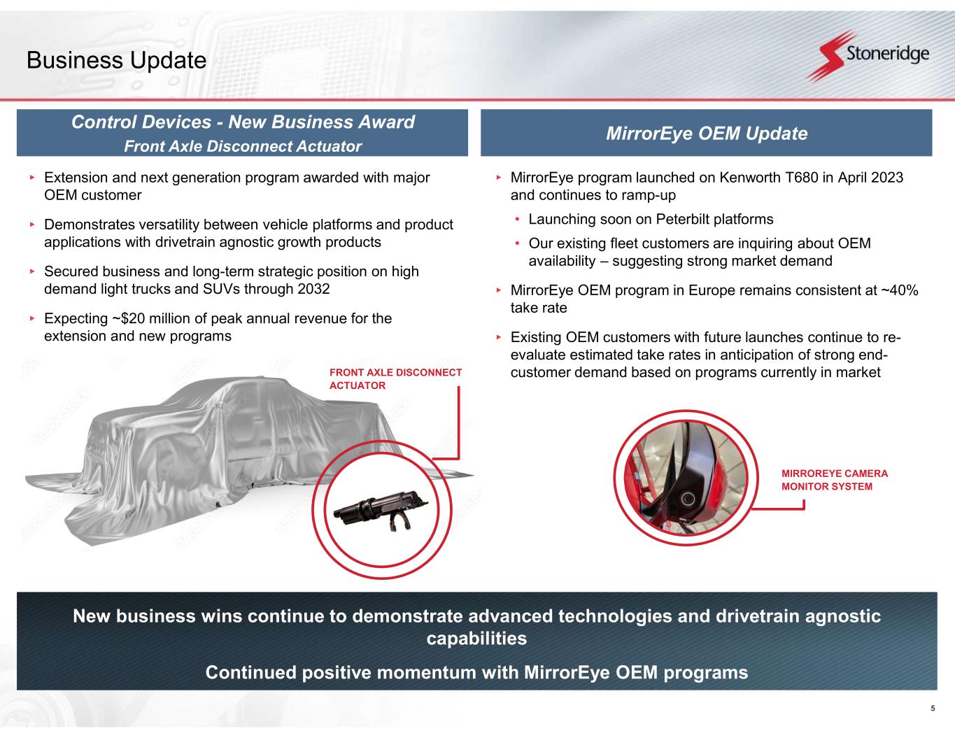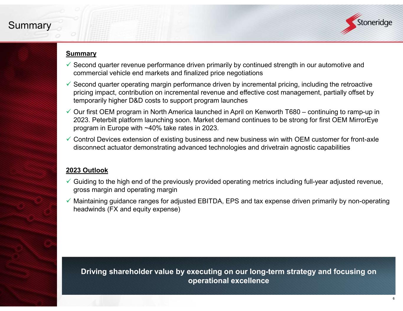 5 ▸ MirrorEye program launched on Kenworth T680 in April 2023 and continues to ramp-up • Launching soon on Peterbilt platforms • Our existing fleet customers are inquiring about OEM availability – suggesting strong market demand ▸ MirrorEye OEM program in Europe remains consistent at ~40% take rate ▸ Existing OEM customers with future launches continue to re- evaluate estimated take rates in anticipation of strong end- customer demand based on programs currently in market MirrorEye OEM Update Business Update New business wins continue to demonstrate advanced technologies and drivetrain agnostic capabilities Continued positive momentum with MirrorEye OEM programs Control Devices - New Business Award Front Axle Disconnect Actuator ▸ Extension and next generation program awarded with major OEM customer ▸ Demonstrates versatility between vehicle platforms and product applications with drivetrain agnostic growth products ▸ Secured business and long-term strategic position on high demand light trucks and SUVs through 2032 ▸ Expecting ~$20 million of peak annual revenue for the extension and new programs MIRROREYE CAMERA MONITOR SYSTEM FRONT AXLE DISCONNECT ACTUATOR