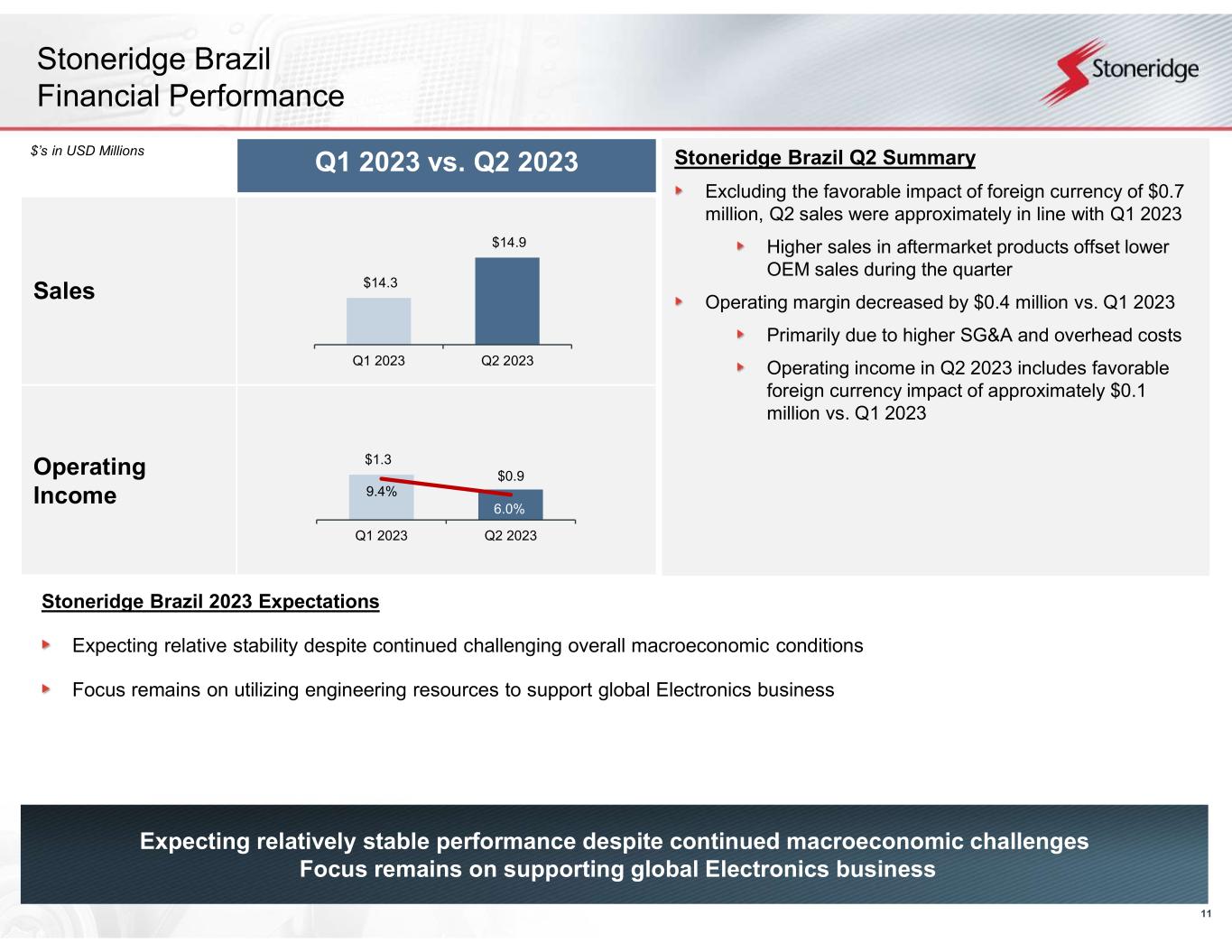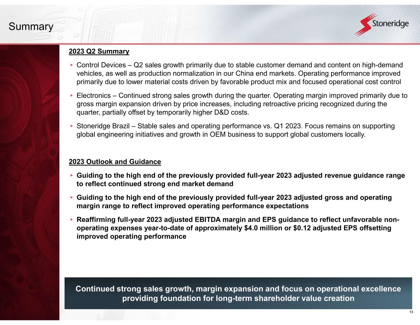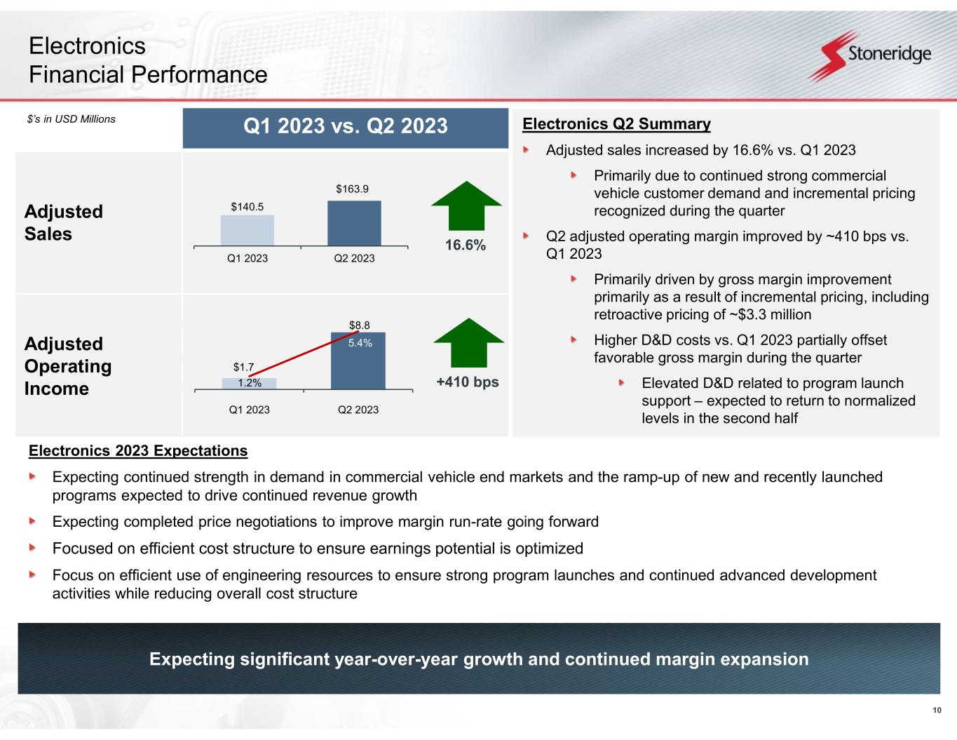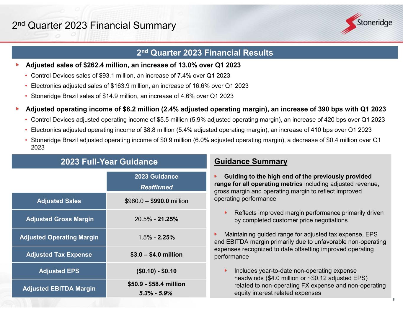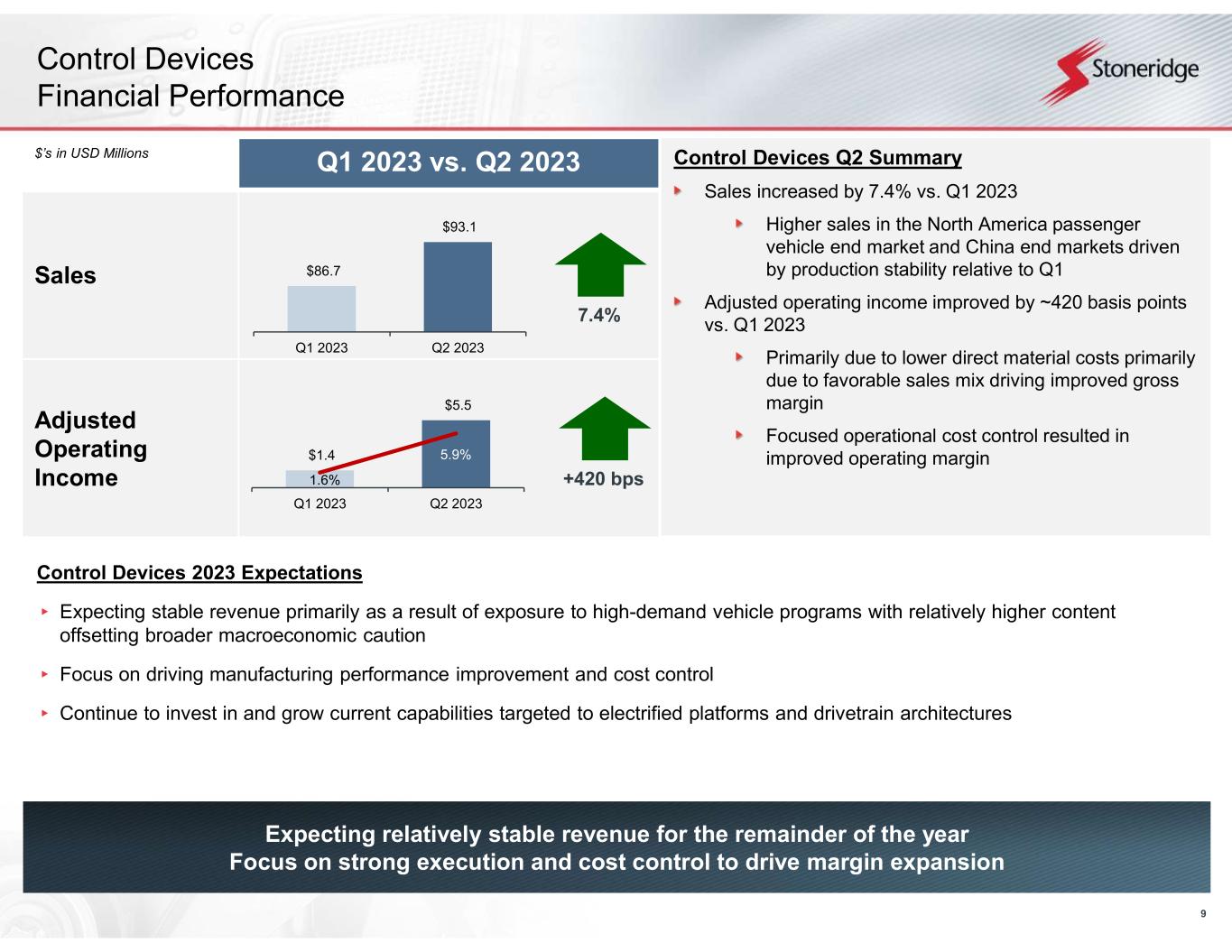 8 2023 Guidance Reaffirmed $960.0 – $990.0 millionAdjusted Sales 20.5% - 21.25%Adjusted Gross Margin 1.5% - 2.25%Adjusted Operating Margin $3.0 – $4.0 millionAdjusted Tax Expense ($0.10) - $0.10Adjusted EPS $50.9 - $58.4 million 5.3% - 5.9% Adjusted EBITDA Margin 2nd Quarter 2023 Financial Summary 2nd Quarter 2023 Financial Results Adjusted sales of $262.4 million, an increase of 13.0% over Q1 2023 • Control Devices sales of $93.1 million, an increase of 7.4% over Q1 2023 • Electronics adjusted sales of $163.9 million, an increase of 16.6% over Q1 2023 • Stoneridge Brazil sales of $14.9 million, an increase of 4.6% over Q1 2023 Adjusted operating income of $6.2 million (2.4% adjusted operating margin), an increase of 390 bps with Q1 2023 • Control Devices adjusted operating income of $5.5 million (5.9% adjusted operating margin), an increase of 420 bps over Q1 2023 • Electronics adjusted operating income of $8.8 million (5.4% adjusted operating margin), an increase of 410 bps over Q1 2023 • Stoneridge Brazil adjusted operating income of $0.9 million (6.0% adjusted operating margin), a decrease of $0.4 million over Q1 2023 2023 Full-Year Guidance Guidance Summary Guiding to the high end of the previously provided range for all operating metrics including adjusted revenue, gross margin and operating margin to reflect improved operating performance Reflects improved margin performance primarily driven by completed customer price negotiations Maintaining guided range for adjusted tax expense, EPS and EBITDA margin primarily due to unfavorable non-operating expenses recognized to date offsetting improved operating performance Includes year-to-date non-operating expense headwinds ($4.0 million or ~$0.12 adjusted EPS) related to non-operating FX expense and non-operating equity interest related expenses