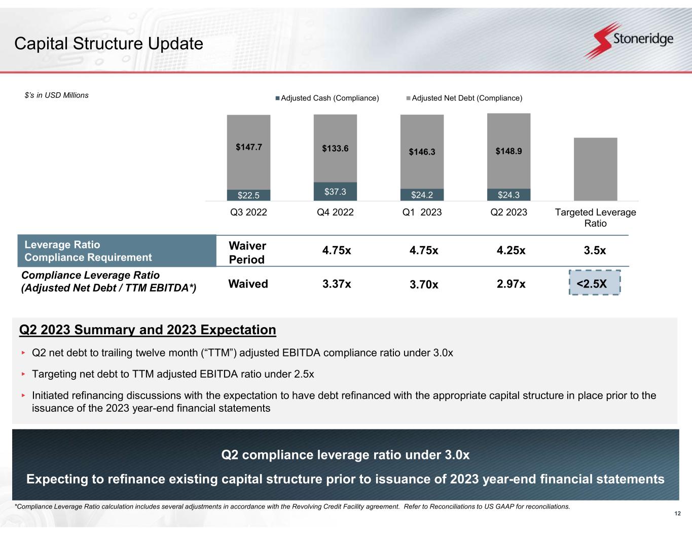 11 Stoneridge Brazil Financial Performance Expecting relatively stable performance despite continued macroeconomic challenges Focus remains on supporting global Electronics business Stoneridge Brazil 2023 Expectations Expecting relative stability despite continued challenging overall macroeconomic conditions Focus remains on utilizing engineering resources to support global Electronics business Stoneridge Brazil Q2 Summary Excluding the favorable impact of foreign currency of $0.7 million, Q2 sales were approximately in line with Q1 2023 Higher sales in aftermarket products offset lower OEM sales during the quarter Operating margin decreased by $0.4 million vs. Q1 2023 Primarily due to higher SG&A and overhead costs Operating income in Q2 2023 includes favorable foreign currency impact of approximately $0.1 million vs. Q1 2023 $’s in USD Millions Q1 2023 vs. Q2 2023 Sales Operating Income $’s in USD Millions $14.3 $14.9 Q1 2023 Q2 2023 $1.3 $0.9 9.4% 6.0% 0 1 2 Q1 2023 Q2 2023