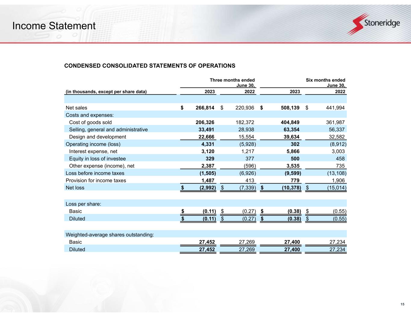 15 Income Statement CONDENSED CONSOLIDATED STATEMENTS OF OPERATIONS Three months ended June 30, Six months ended June 30, (in thousands, except per share data) 2023 2022 2023 2022 Net sales $ 266,814 $ 220,936 $ 508,139 $ 441,994 Costs and expenses: Cost of goods sold 206,326 182,372 404,849 361,987 Selling, general and administrative 33,491 28,938 63,354 56,337 Design and development 22,666 15,554 39,634 32,582 Operating income (loss) 4,331 (5,928) 302 (8,912) Interest expense, net 3,120 1,217 5,866 3,003 Equity in loss of investee 329 377 500 458 Other expense (income), net 2,387 (596) 3,535 735 Loss before income taxes (1,505) (6,926) (9,599) (13,108) Provision for income taxes 1,487 413 779 1,906 Net loss $ (2,992) $ (7,339) $ (10,378) $ (15,014) Loss per share: Basic $ (0.11) $ (0.27) $ (0.38) $ (0.55) Diluted $ (0.11) $ (0.27) $ (0.38) $ (0.55) Weighted-average shares outstanding: Basic 27,452 27,269 27,400 27,234 Diluted 27,452 27,269 27,400 27,234