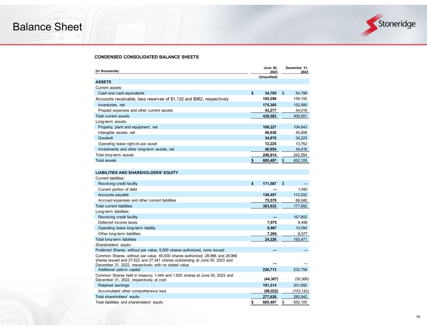 16 Balance Sheet CONDENSED CONSOLIDATED BALANCE SHEETS (in thousands) June 30, 2023 December 31, 2022 (Unaudited) ASSETS Current assets: Cash and cash equivalents $ 34,705 $ 54,798 Accounts receivable, less reserves of $1,132 and $962, respectively 185,296 158,155 Inventories, net 175,305 152,580 Prepaid expenses and other current assets 43,277 44,018 Total current assets 438,583 409,551 Long-term assets: Property, plant and equipment, net 106,227 104,643 Intangible assets, net 46,638 45,508 Goodwill 34,870 34,225 Operating lease right-of-use asset 12,225 13,762 Investments and other long-term assets, net 46,954 44,416 Total long-term assets 246,914 242,554 Total assets $ 685,497 $ 652,105 LIABILITIES AND SHAREHOLDERS' EQUITY Current liabilities: Revolving credit facility $ 171,597 $ — Current portion of debt — 1,450 Accounts payable 136,457 110,202 Accrued expenses and other current liabilities 75,579 66,040 Total current liabilities 383,633 177,692 Long-term liabilities: Revolving credit facility — 167,802 Deferred income taxes 7,975 8,498 Operating lease long-term liability 8,967 10,594 Other long-term liabilities 7,284 6,577 Total long-term liabilities 24,226 193,471 Shareholders' equity: Preferred Shares, without par value, 5,000 shares authorized, none issued — — Common Shares, without par value, 60,000 shares authorized, 28,966 and 28,966 shares issued and 27,522 and 27,341 shares outstanding at June 30, 2023 and December 31, 2022, respectively, with no stated value — — Additional paid-in capital 226,713 232,758 Common Shares held in treasury, 1,444 and 1,625 shares at June 30, 2023 and December 31, 2022, respectively, at cost (44,367) (50,366) Retained earnings 191,314 201,692 Accumulated other comprehensive loss (96,022) (103,142) Total shareholders' equity 277,638 280,942 Total liabilities and shareholders' equity $ 685,497 $ 652,105
