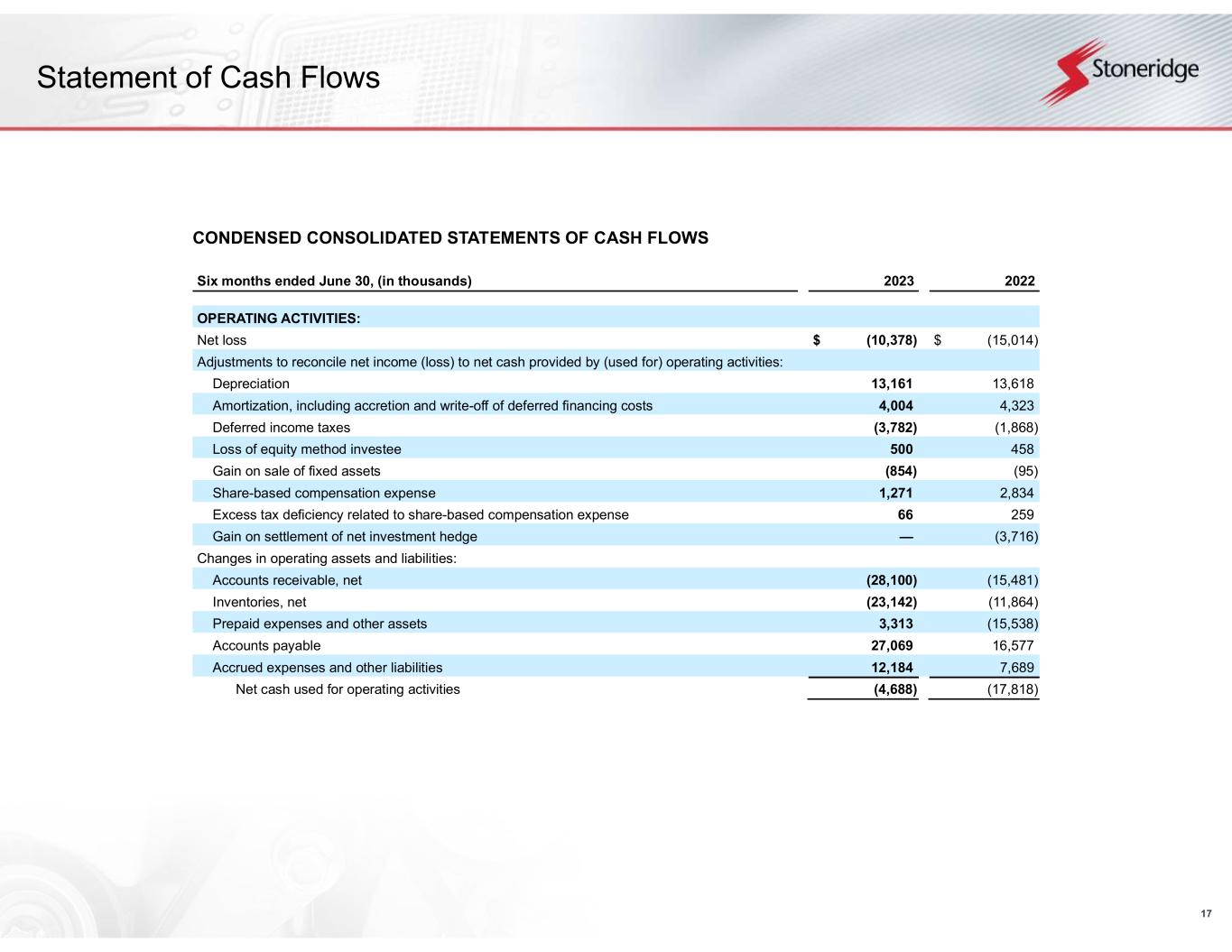 17 Statement of Cash Flows CONDENSED CONSOLIDATED STATEMENTS OF CASH FLOWS Six months ended June 30, (in thousands) 2023 2022 OPERATING ACTIVITIES: Net loss $ (10,378) $ (15,014) Adjustments to reconcile net income (loss) to net cash provided by (used for) operating activities: Depreciation 13,161 13,618 Amortization, including accretion and write-off of deferred financing costs 4,004 4,323 Deferred income taxes (3,782) (1,868) Loss of equity method investee 500 458 Gain on sale of fixed assets (854) (95) Share-based compensation expense 1,271 2,834 Excess tax deficiency related to share-based compensation expense 66 259 Gain on settlement of net investment hedge — (3,716) Changes in operating assets and liabilities: Accounts receivable, net (28,100) (15,481) Inventories, net (23,142) (11,864) Prepaid expenses and other assets 3,313 (15,538) Accounts payable 27,069 16,577 Accrued expenses and other liabilities 12,184 7,689 Net cash used for operating activities (4,688) (17,818)