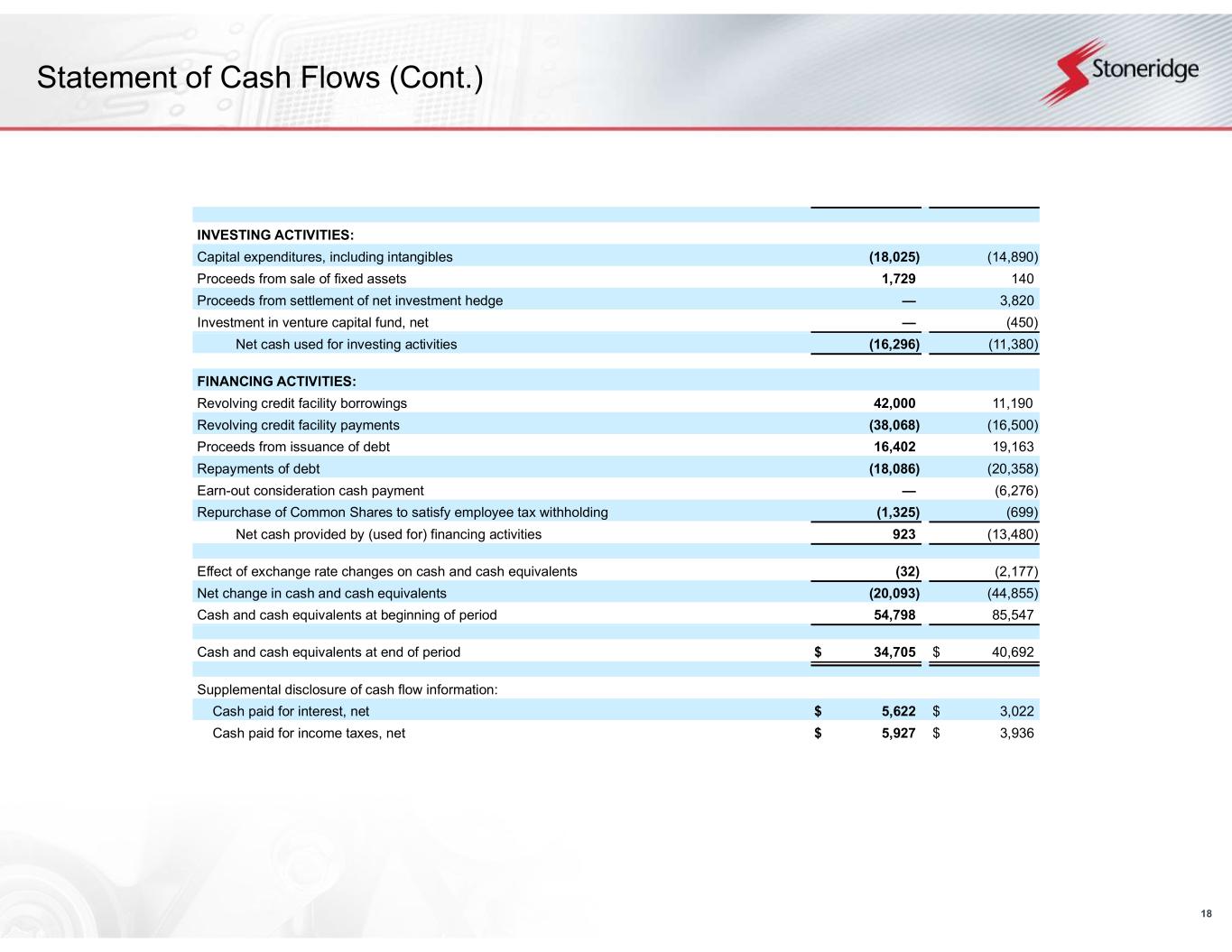 18 Statement of Cash Flows (Cont.) INVESTING ACTIVITIES: Capital expenditures, including intangibles (18,025) (14,890) Proceeds from sale of fixed assets 1,729 140 Proceeds from settlement of net investment hedge — 3,820 Investment in venture capital fund, net — (450) Net cash used for investing activities (16,296) (11,380) FINANCING ACTIVITIES: Revolving credit facility borrowings 42,000 11,190 Revolving credit facility payments (38,068) (16,500) Proceeds from issuance of debt 16,402 19,163 Repayments of debt (18,086) (20,358) Earn-out consideration cash payment — (6,276) Repurchase of Common Shares to satisfy employee tax withholding (1,325) (699) Net cash provided by (used for) financing activities 923 (13,480) Effect of exchange rate changes on cash and cash equivalents (32) (2,177) Net change in cash and cash equivalents (20,093) (44,855) Cash and cash equivalents at beginning of period 54,798 85,547 Cash and cash equivalents at end of period $ 34,705 $ 40,692 Supplemental disclosure of cash flow information: Cash paid for interest, net $ 5,622 $ 3,022 Cash paid for income taxes, net $ 5,927 $ 3,936
