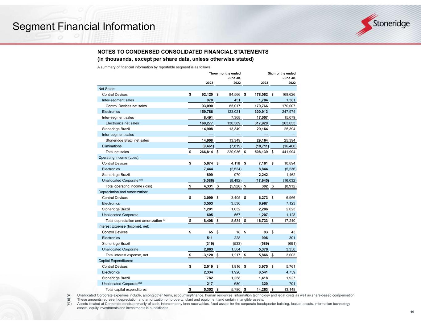 19 Segment Financial Information NOTES TO CONDENSED CONSOLIDATED FINANCIAL STATEMENTS (in thousands, except per share data, unless otherwise stated) A summary of financial information by reportable segment is as follows: Three months ended June 30, Six months ended June 30, 2023 2022 2023 2022 Net Sales: Control Devices $ 92,120 $ 84,566 $ 178,062 $ 168,626 Inter-segment sales 970 451 1,704 1,381 Control Devices net sales 93,090 85,017 179,766 170,007 Electronics 159,786 123,021 300,913 247,974 Inter-segment sales 8,491 7,368 17,007 15,079 Electronics net sales 168,277 130,389 317,920 263,053 Stoneridge Brazil 14,908 13,349 29,164 25,394 Inter-segment sales — — — — Stoneridge Brazil net sales 14,908 13,349 29,164 25,394 Eliminations (9,461) (7,819) (18,711) (16,460) Total net sales $ 266,814 $ 220,936 $ 508,139 $ 441,994 Operating Income (Loss): Control Devices $ 5,074 $ 4,118 $ 7,161 $ 10,894 Electronics 7,444 (2,524) 8,844 (5,236) Stoneridge Brazil 899 970 2,242 1,462 Unallocated Corporate (A) (9,086) (8,492) (17,945) (16,032) Total operating income (loss) $ 4,331 $ (5,928) $ 302 $ (8,912) Depreciation and Amortization: Control Devices $ 3,099 $ 3,405 $ 6,273 $ 6,966 Electronics 3,503 3,530 6,967 7,123 Stoneridge Brazil 1,201 1,032 2,286 2,023 Unallocated Corporate 605 567 1,207 1,128 Total depreciation and amortization (B) $ 8,408 $ 8,534 $ 16,733 $ 17,240 Interest Expense (Income), net: Control Devices $ 65 $ 18 $ 83 $ 43 Electronics 511 228 996 301 Stoneridge Brazil (319) (533) (589) (691) Unallocated Corporate 2,863 1,504 5,376 3,350 Total interest expense, net $ 3,120 $ 1,217 $ 5,866 $ 3,003 Capital Expenditures: Control Devices $ 2,019 $ 1,916 $ 3,975 $ 5,761 Electronics 2,334 1,926 8,541 4,759 Stoneridge Brazil 782 1,258 1,418 1,927 Unallocated Corporate(C) 217 680 329 701 Total capital expenditures $ 5,352 $ 5,780 $ 14,263 $ 13,148 (A) Unallocated Corporate expenses include, among other items, accounting/finance, human resources, information technology and legal costs as well as share-based compensation. (B) These amounts represent depreciation and amortization on property, plant and equipment and certain intangible assets. (C) Assets located at Corporate consist primarily of cash, intercompany loan receivables, fixed assets for the corporate headquarter building, leased assets, information technology assets, equity investments and investments in subsidiaries.
