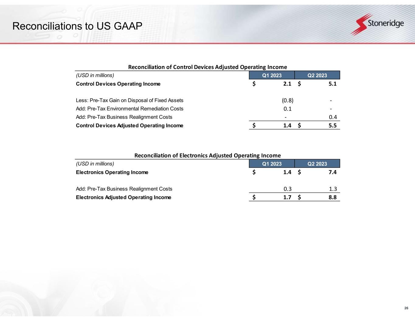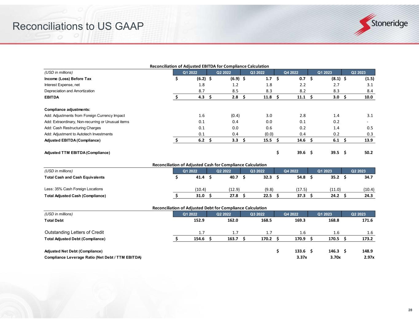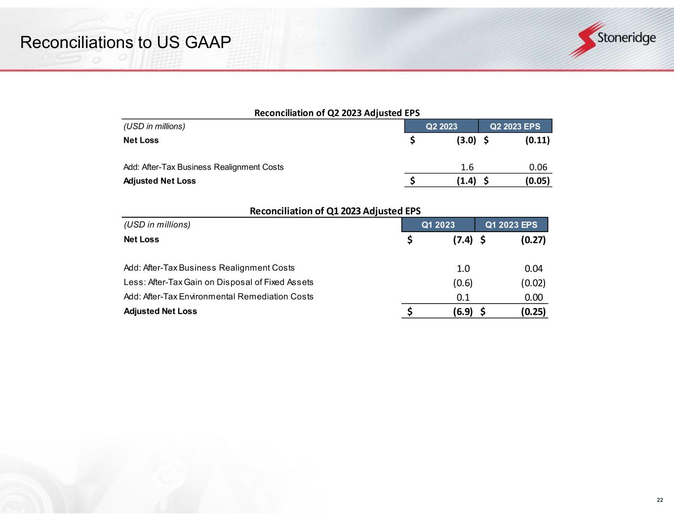 21 Reconciliations to US GAAP This document contains information about Stoneridge's financial results which is not presented in accordance with accounting principles generally accepted in the United States ("GAAP"). Such non-GAAP financial measures are reconciled to their closest GAAP financial measures in the appendix of this document. The provision of these non- GAAP financial measures is not intended to indicate that Stoneridge is explicitly or implicitly providing projections on those non-GAAP financial measures, and actual results for such measures are likely to vary from those presented. The reconciliations include all information reasonably available to the Company at the date of this document and the adjustments that management can reasonably predict.