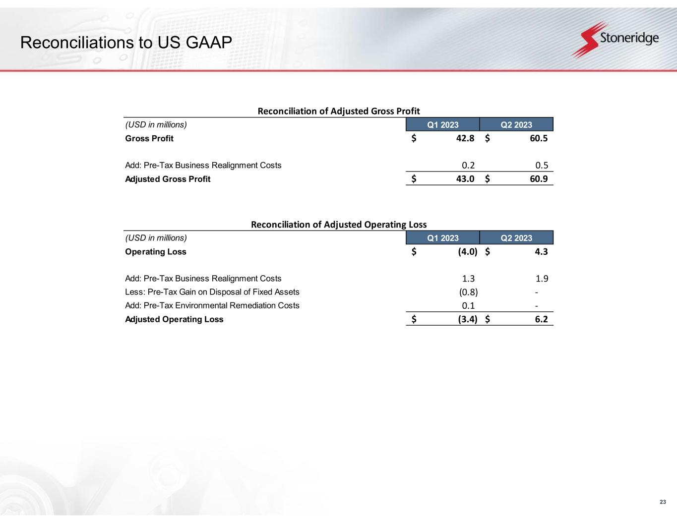 22 Reconciliations to US GAAP (USD in millions) Q1 2023 Q1 2023 EPS Net Loss (7.4)$ (0.27)$ Add: After-Tax Business Realignment Costs 1.0 0.04 Less: After-Tax Gain on Disposal of Fixed Assets (0.6) (0.02) Add: After-Tax Environmental Remediation Costs 0.1 0.00 Adjusted Net Loss (6.9)$ (0.25)$ Reconciliation of Q1 2023 Adjusted EPS (USD in millions) Q2 2023 Q2 2023 EPS Net Loss (3.0)$ (0.11)$ Add: After-Tax Business Realignment Costs 1.6 0.06 Adjusted Net Loss (1.4)$ (0.05)$ Reconciliation of Q2 2023 Adjusted EPS