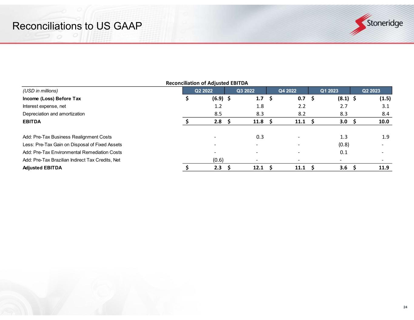23 Reconciliations to US GAAP Reconciliation of Adjusted Gross Profit (USD in millions) Q1 2023 Q2 2023 Gross Profit 42.8$ 60.5$ Add: Pre-Tax Business Realignment Costs 0.2 0.5 Adjusted Gross Profit 43.0$ 60.9$ Reconciliation of Adjusted Operating Loss (USD in millions) Q1 2023 Q2 2023 Operating Loss (4.0)$ 4.3$ Add: Pre-Tax Business Realignment Costs 1.3 1.9 Less: Pre-Tax Gain on Disposal of Fixed Assets (0.8) - Add: Pre-Tax Environmental Remediation Costs 0.1 - Adjusted Operating Loss (3.4)$ 6.2$