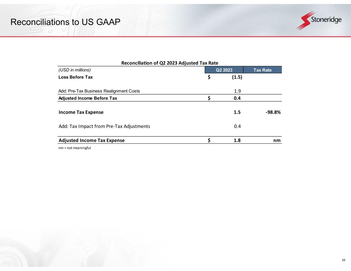 24 Reconciliations to US GAAP Reconciliation of Adjusted EBITDA (USD in millions) Q2 2022 Q3 2022 Q4 2022 Q1 2023 Q2 2023 Income (Loss) Before Tax (6.9)$ 1.7$ 0.7$ (8.1)$ (1.5)$ Interest expense, net 1.2 1.8 2.2 2.7 3.1 Depreciation and amortization 8.5 8.3 8.2 8.3 8.4 EBITDA 2.8$ 11.8$ 11.1$ 3.0$ 10.0$ Add: Pre-Tax Business Realignment Costs - 0.3 - 1.3 1.9 Less: Pre-Tax Gain on Disposal of Fixed Assets - - - (0.8) - Add: Pre-Tax Environmental Remediation Costs - - - 0.1 - Add: Pre-Tax Brazilian Indirect Tax Credits, Net (0.6) - - - - Adjusted EBITDA 2.3$ 12.1$ 11.1$ 3.6$ 11.9$