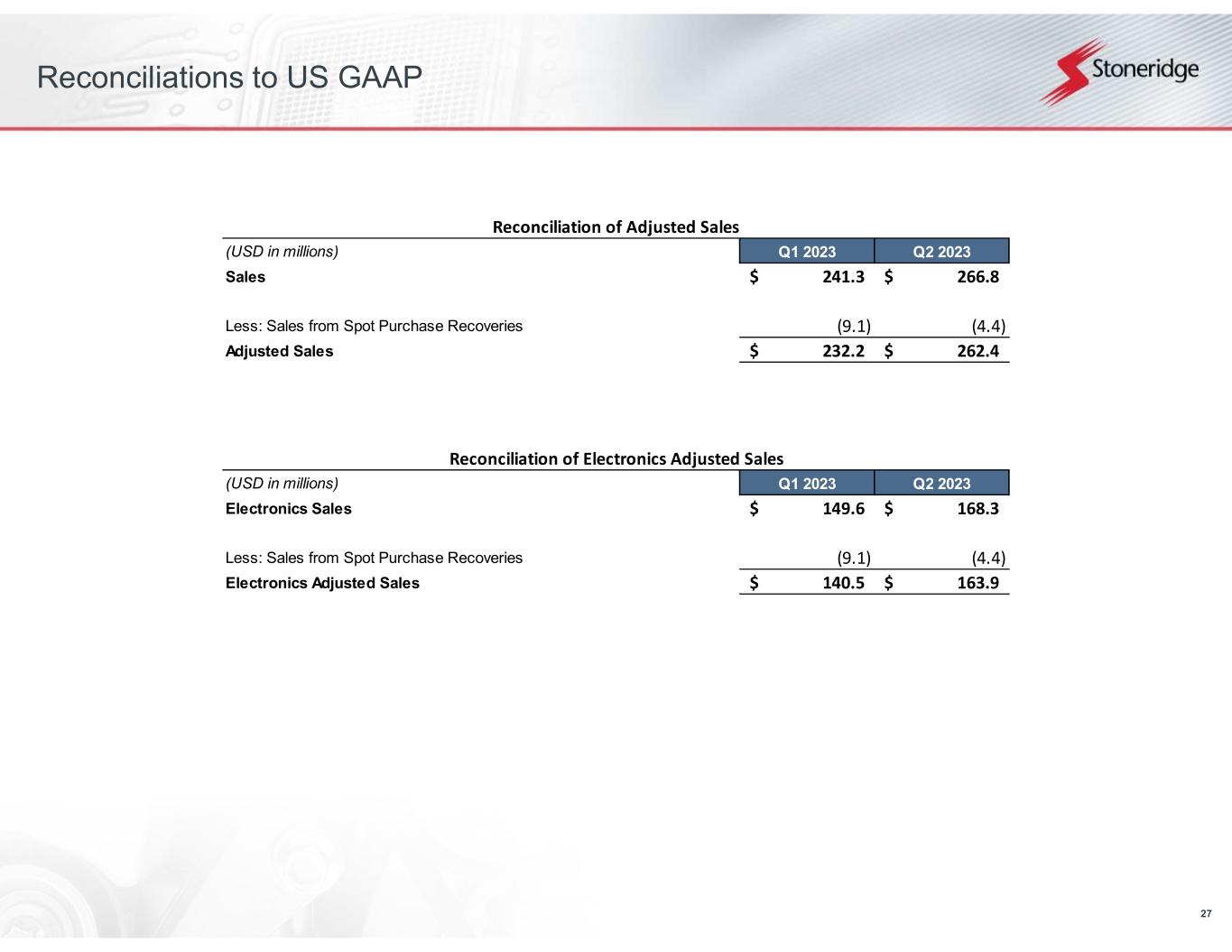 26 Reconciliations to US GAAP Reconciliation of Electronics Adjusted Operating Income (USD in millions) Q1 2023 Q2 2023 Electronics Operating Income 1.4$ 7.4$ Add: Pre-Tax Business Realignment Costs 0.3 1.3 Electronics Adjusted Operating Income 1.7$ 8.8$ Reconciliation of Control Devices Adjusted Operating Income (USD in millions) Q1 2023 Q2 2023 Control Devices Operating Income 2.1$ 5.1$ Less: Pre-Tax Gain on Disposal of Fixed Assets (0.8) - Add: Pre-Tax Environmental Remediation Costs 0.1 - Add: Pre-Tax Business Realignment Costs - 0.4 Control Devices Adjusted Operating Income 1.4$ 5.5$