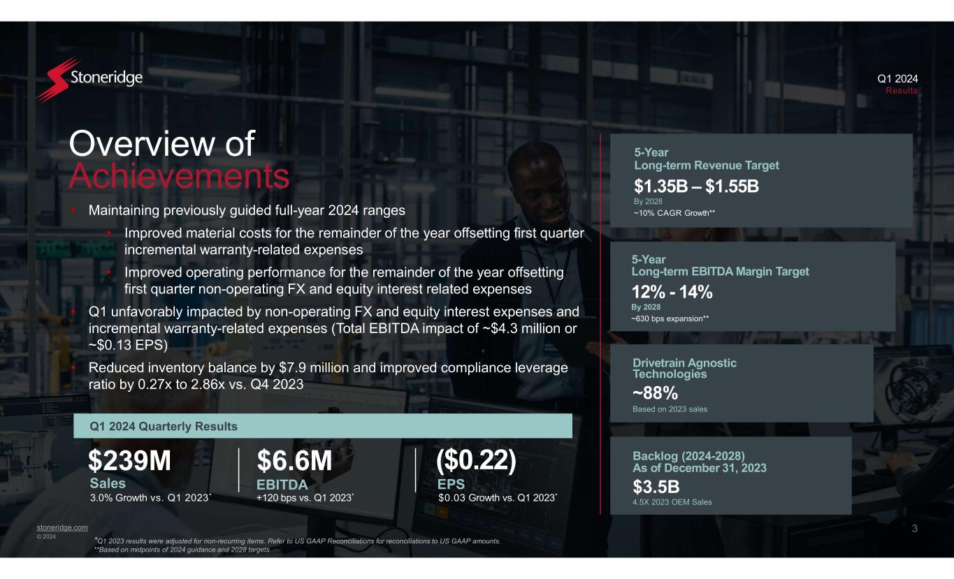 stoneridge.com © 2024 Q1 2024 Results 2 Forward-Looking Statements Statements in this presentation that are not historical facts are forward-looking statements, which involve risks and uncertainties that could cause actual events or results to differ materially from those expressed or implied by the statements. Important factors that may cause actual results to differ materially from those in the forward-looking statements include, among other factors, the ability of our suppliers to supply us parts and components at competitive prices on a timely basis, including the impact of potential tariffs and trade considerations on their operations and output; fluctuations in the cost and availability of key materials (including semiconductors, printed circuit boards, resin, aluminum, steel and copper) and components and our ability to offset cost increases through negotiated price increases with our customers or other cost actions, as necessary; global economic trends, competition and geopolitical risks, including impacts from ongoing or potential conflicts and any related sanctions and other measures, or an escalation of sanctions, tariffs or other trade tensions between the U.S. and other countries; our ability to achieve cost reductions that offset or exceed customer-mandated selling price reductions; the reduced purchases, loss or bankruptcy of a major customer or supplier; the costs and timing of business realignment, facility closures or similar actions; a significant change in automotive, commercial, off-highway or agricultural vehicle production; competitive market conditions and resulting effects on sales and pricing; foreign currency fluctuations and our ability to manage those impacts; customer acceptance of new products; our ability to successfully launch/produce products for awarded business; adverse changes in laws, government regulations or market conditions, affecting our products, our suppliers, or our customers’ products; labor disruptions at Stoneridge’s facilities or at any of Stoneridge significant customers or suppliers; the amount of Stoneridge’s indebtedness and the restrictive covenants contained in the agreements governing its indebtedness, including its revolving Credit Facility; capital availability or costs, including changes in interest rates; the occurrence or non-occurrence of circumstances beyond Stoneridge’s control; and the items described in “Risk Factors” and other uncertainties or risks discussed in Stoneridge’s periodic and current reports filed with the Securities and Exchange Commission. Important factors that could cause the performance of the commercial vehicle and automotive industry to differ materially from those in the forward-looking statements include factors such as (1) continued economic instability or poor economic conditions in the United States and global markets, (2) changes in economic conditions, housing prices, foreign currency exchange rates, commodity prices, including shortages of and increases or volatility in the price of oil, (3) changes in laws and regulations, (4) the state of the credit markets, (5) political stability, (6) international conflicts and (7) the occurrence of force majeure events. These factors should not be construed as exhaustive and should be considered with the other cautionary statements in Stoneridge’s filings with the Securities and Exchange Commission. Forward-looking statements are not guarantees of future performance; Stoneridge’s actual results of operations, financial condition and liquidity, and the development of the industry in which Stoneridge operates may differ materially from those described in or suggested by the forward-looking statements contained in this presentation. In addition, even if Stoneridge’s results of operations, financial condition and liquidity, and the development of the industry in which Stoneridge operates are consistent with the forward-looking statements contained in this presentation, those results or developments may not be indicative of results or developments in subsequent periods. This presentation contains time-sensitive information that reflects management’s best analysis only as of the date of this presentation. Any forward-looking statements in this presentation speak only as of the date of this presentation, and Stoneridge undertakes no obligation to update such statements. Comparisons of results for current and any prior periods are not intended to express any future trends or indications of future performance, unless expressed as such, and should only be viewed as historical data Stoneridge does not undertake any obligation to publicly update or revise any forward-looking statement as a result of new information, future events or otherwise, except as otherwise required by law. Rounding Disclosure: There may be slight immaterial differences between figures represented in our public filings compared to what is shown in this presentation. The differences are the result of rounding due to the representation of values in millions rather than thousands in public filings.