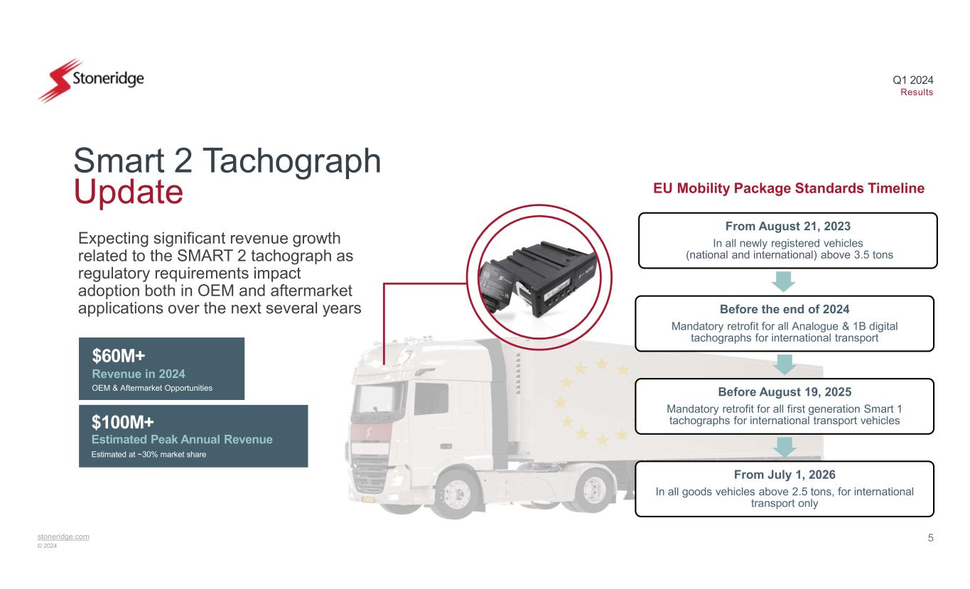 4stoneridge.com © 2024 Q1 2024 Results Sales Gross Profit Operating Income EBITDA Q1 2023* vs. Q1 2024 +3.0% +170 bps +160 bps +120 bps First quarter performance driven by material cost improvement and focus on managing cost structure Financial Summary Q1 2024 Key Drivers • Sales growth of 3.0% vs. Q1 2023 driven by higher sales in the commercial vehicle end markets partially offset by lower North American passenger vehicle sales, due in part to the slowing demand for EVs • Continued margin expansion despite incremental warranty-related items of ~$2.0 million and non-operating FX and equity interest headwinds of ~$2.3 million • Higher gross margin primarily driven by material cost improvements offset by higher warranty-related costs • Stable operating cost structure – recent actions to continue to improve run-rate operating expenses • Incremental warranty costs related to two specific historical issues • Excluding the incremental warranty and non-operating expenses in the quarter of ~$4.3 million in total, Q1 EBITDA would have been approximately $10.9 million, or 4.6% of revenue -1.5% -1.0% $232.2 $239.2 Q1 2023 Q1 2024 0.8% *Q1 2023 results were adjusted for non-recurring items. Refer to US GAAP Reconciliations for reconciliations to US GAAP amounts. $3.6 $6.6 1.5% 2.8% Q1 2023 Q1 2024 $43.0 $48.4 18.5% 20.2% Q1 2023 Q1 2024 $(3.4) $0.3 -1.5 0.1% Q1 2023 Q1 2024