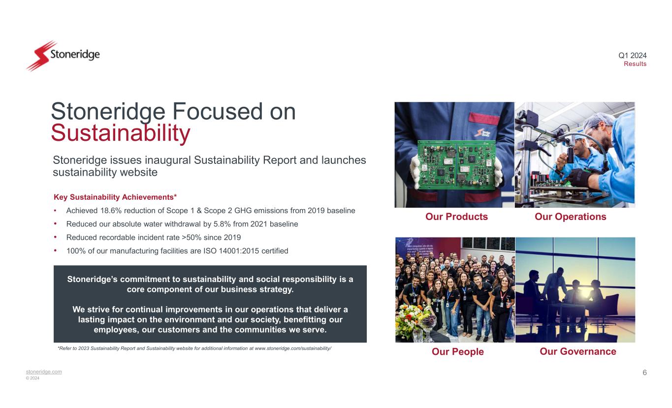 stoneridge.com © 2024 Q1 2024 Results 5 Smart 2 Tachograph Update From August 21, 2023 In all newly registered vehicles (national and international) above 3.5 tons Before the end of 2024 Mandatory retrofit for all Analogue & 1B digital tachographs for international transport Before August 19, 2025 Mandatory retrofit for all first generation Smart 1 tachographs for international transport vehicles From July 1, 2026 In all goods vehicles above 2.5 tons, for international transport only $60M+ Revenue in 2024 OEM & Aftermarket Opportunities EU Mobility Package Standards Timeline $100M+ Estimated Peak Annual Revenue Estimated at ~30% market share Expecting significant revenue growth related to the SMART 2 tachograph as regulatory requirements impact adoption both in OEM and aftermarket applications over the next several years