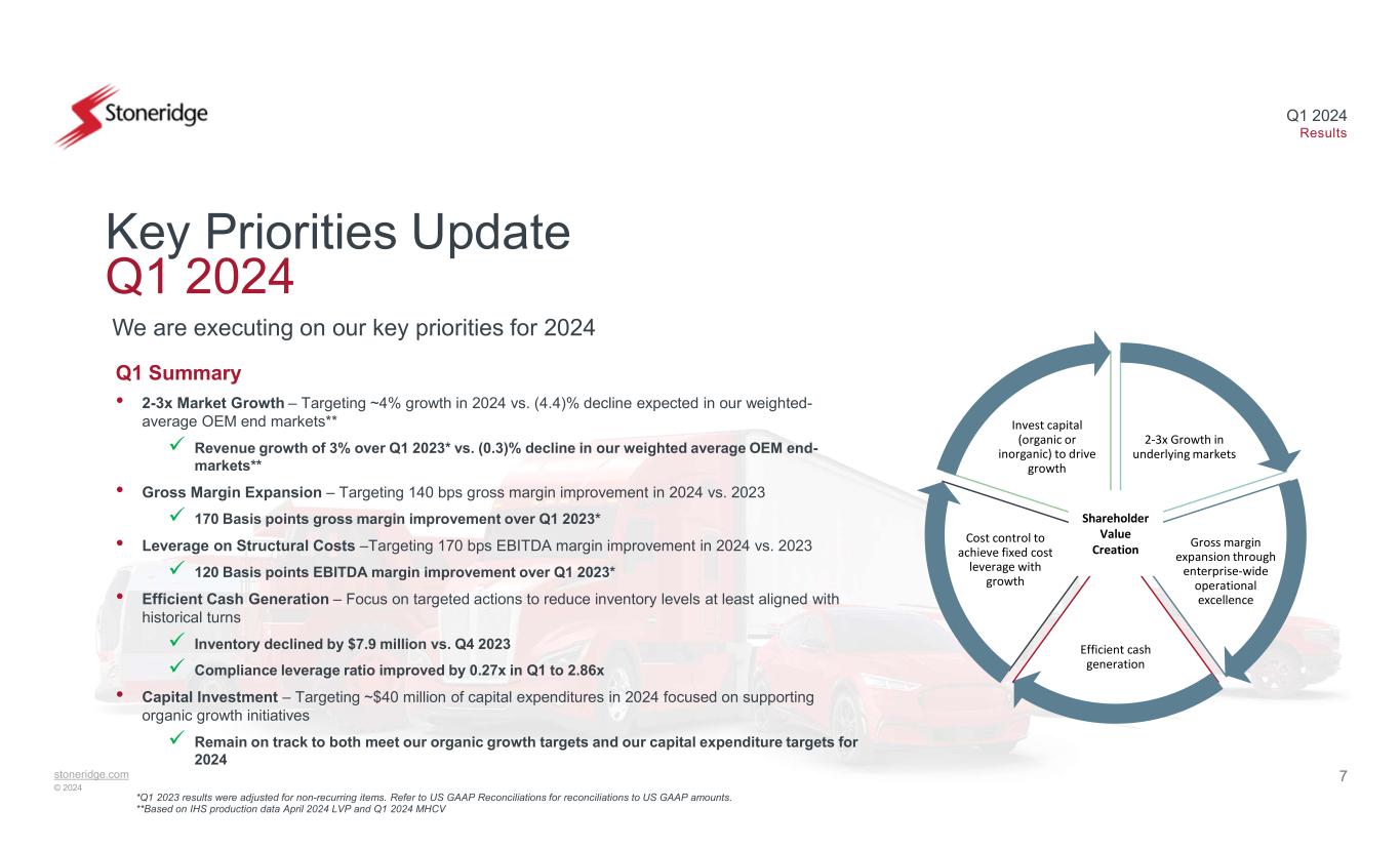 stoneridge.com © 2024 Q1 2024 Results 6 Stoneridge Focused on Sustainability Stoneridge issues inaugural Sustainability Report and launches sustainability website Our Products Our Operations Our People Our Governance*Refer to 2023 Sustainability Report and Sustainability website for additional information at www.stoneridge.com/sustainability/ Key Sustainability Achievements* • Achieved 18.6% reduction of Scope 1 & Scope 2 GHG emissions from 2019 baseline • Reduced our absolute water withdrawal by 5.8% from 2021 baseline • Reduced recordable incident rate >50% since 2019 • 100% of our manufacturing facilities are ISO 14001:2015 certified Stoneridge’s commitment to sustainability and social responsibility is a core component of our business strategy. We strive for continual improvements in our operations that deliver a lasting impact on the environment and our society, benefitting our employees, our customers and the communities we serve.