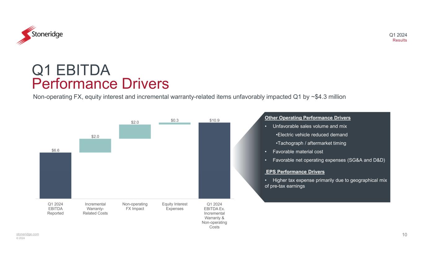 9stoneridge.com © 2024 Q1 2024 Results Q1 2024 Financial Highlights Q1 2024 Reported 2024 Full-Year Guidance $990.0 million - $1.01 billion$239.2 million Sales $217.8 million - $229.8 million 22.0% - 22.75% $48.4 million 20.2% Gross Profit Margin $27.2 million - $32.8 million 2.75% - 3.25% $0.3 million 0.1% Operating Income Margin $0.30 - $0.40($0.22)EPS $64 million - $70 million 6.5% - 6.9% $6.6 million 2.8% EBITDA Margin 2024 Full-Year Guidance • Maintaining previously provided revenue guidance ranges as revenue is expected to continue to outperform our underlying end markets based on Stoneridge specific growth drivers. Full-year growth of ~4% vs. weighted-average OEM end market expected decline of (4.4)%*. • Maintaining previously provided gross profit guidance as improved material cost run-rate offset by increased warranty expense in Q1 • Maintaining operating income guidance based on improved material cost expectations and continued focus on reducing operating expenses • Maintaining previously guided EPS and EBITDA ranges based on the expectation of slight improvement in operating performance offset by non-operating FX and equity interest expenses in Q1 Maintaining full-year 2024 guidance ranges *Based on IHS production data April 2024 LVP and Q1 2024 MHCV