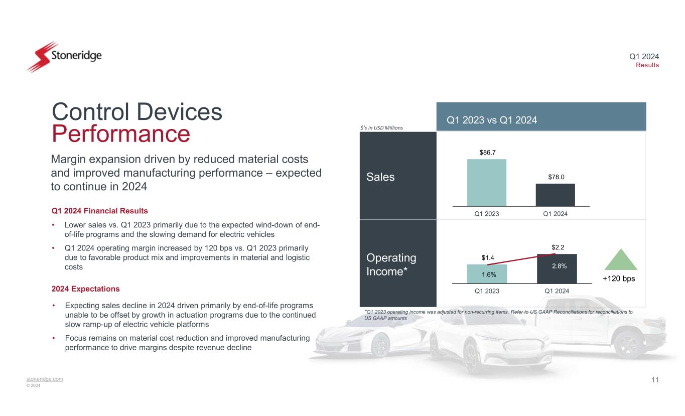 stoneridge.com © 2024 Q1 2024 Results 10 Non-operating FX, equity interest and incremental warranty-related items unfavorably impacted Q1 by ~$4.3 million Q1 EBITDA Performance Drivers Other Operating Performance Drivers • Unfavorable sales volume and mix •Electric vehicle reduced demand •Tachograph / aftermarket timing • Favorable material cost • Favorable net operating expenses (SG&A and D&D) EPS Performance Drivers • Higher tax expense primarily due to geographical mix of pre-tax earnings