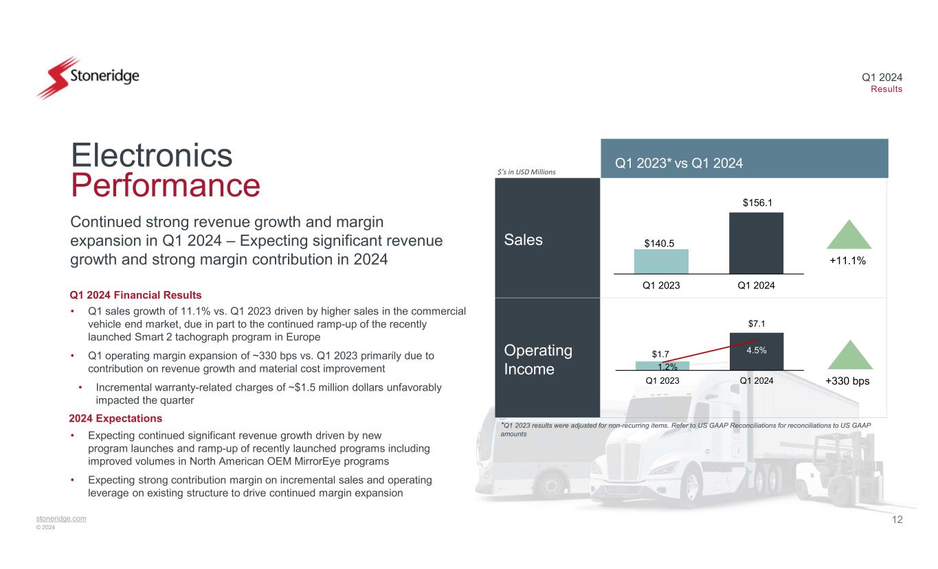 11stoneridge.com © 2024 Q1 2024 Results Sales Operating Income* $’s in USD Millions Margin expansion driven by reduced material costs and improved manufacturing performance – expected to continue in 2024 Control Devices Performance Q1 2024 Financial Results 2024 Expectations • Lower sales vs. Q1 2023 primarily due to the expected wind-down of end- of-life programs and the slowing demand for electric vehicles • Q1 2024 operating margin increased by 120 bps vs. Q1 2023 primarily due to favorable product mix and improvements in material and logistic costs • Expecting sales decline in 2024 driven primarily by end-of-life programs unable to be offset by growth in actuation programs due to the continued slow ramp-up of electric vehicle platforms • Focus remains on material cost reduction and improved manufacturing performance to drive margins despite revenue decline 2.2% 2.2% $86.7 $78.0 Q1 2023 Q1 2024 $1.4 $2.2 1.6% 2.8% Q1 2023 Q1 2024 *Q1 2023 operating income was adjusted for non-recurring items. Refer to US GAAP Reconciliations for reconciliations to US GAAP amounts Q1 2023 vs Q1 2024 +120 bps