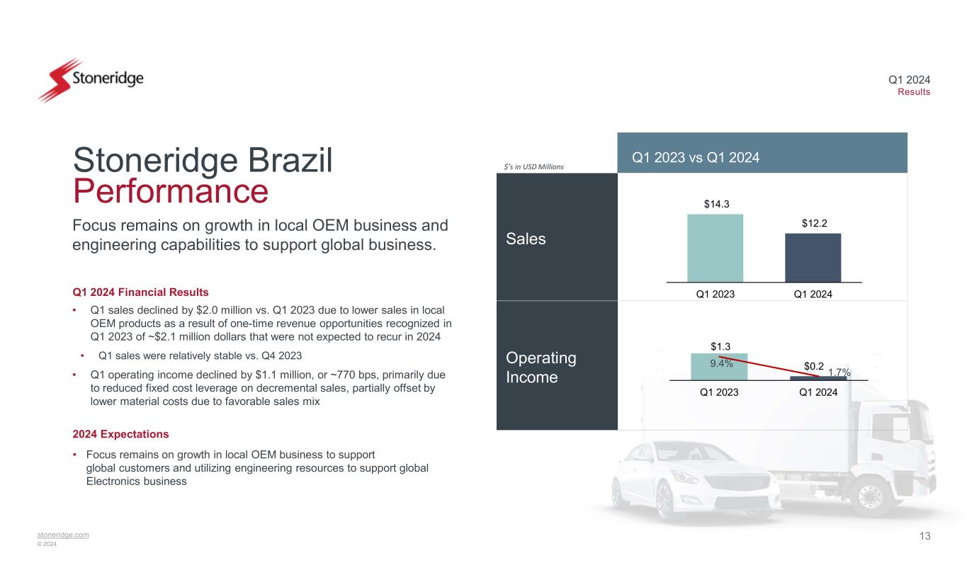 12stoneridge.com © 2024 Q1 2024 Results Sales Operating Income Q1 2023* vs Q1 2024 $’s in USD Millions Continued strong revenue growth and margin expansion in Q1 2024 – Expecting significant revenue growth and strong margin contribution in 2024 Electronics Performance $140.5 $156.1 Q1 2023 Q1 2024 Q1 2024 Financial Results 2024 Expectations • Q1 sales growth of 11.1% vs. Q1 2023 driven by higher sales in the commercial vehicle end market, due in part to the continued ramp-up of the recently launched Smart 2 tachograph program in Europe • Q1 operating margin expansion of ~330 bps vs. Q1 2023 primarily due to contribution on revenue growth and material cost improvement • Incremental warranty-related charges of ~$1.5 million dollars unfavorably impacted the quarter • Expecting continued significant revenue growth driven by new program launches and ramp-up of recently launched programs including improved volumes in North American OEM MirrorEye programs • Expecting strong contribution margin on incremental sales and operating leverage on existing structure to drive continued margin expansion $1.7 $7.1 1.2% 4.5% Q1 2023 Q1 2024 *Q1 2023 results were adjusted for non-recurring items. Refer to US GAAP Reconciliations for reconciliations to US GAAP amounts +330 bps +11.1%