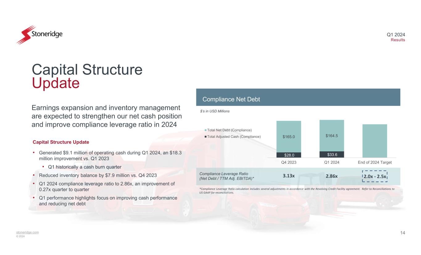 13stoneridge.com © 2024 Q1 2024 Results Sales Operating Income Q1 2023 vs Q1 2024 $’s in USD Millions Focus remains on growth in local OEM business and engineering capabilities to support global business. Stoneridge Brazil Performance 1.7% Q1 2024 Financial Results 2024 Expectations • Q1 sales declined by $2.0 million vs. Q1 2023 due to lower sales in local OEM products as a result of one-time revenue opportunities recognized in Q1 2023 of ~$2.1 million dollars that were not expected to recur in 2024 • Q1 sales were relatively stable vs. Q4 2023 • Q1 operating income declined by $1.1 million, or ~770 bps, primarily due to reduced fixed cost leverage on decremental sales, partially offset by lower material costs due to favorable sales mix • Focus remains on growth in local OEM business to support global customers and utilizing engineering resources to support global Electronics business $14.3 $12.2 Q1 2023 Q1 2024 $1.3 $0.2 9.4% 1.7% 0% 5% 10% 0 0.5 1 1.5 Q1 2023 Q1 2024