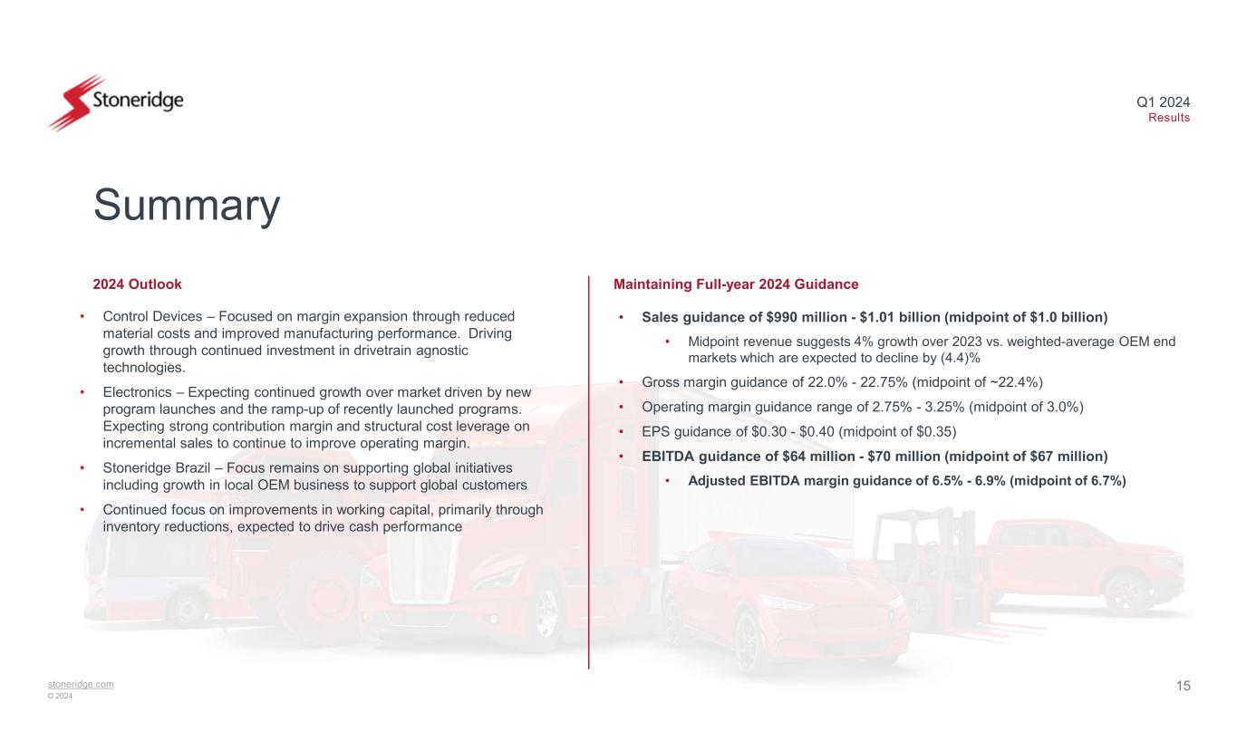 14stoneridge.com © 2024 Q1 2024 Results Earnings expansion and inventory management are expected to strengthen our net cash position and improve compliance leverage ratio in 2024 Capital Structure Update Capital Structure Update • Generated $9.1 million of operating cash during Q1 2024, an $18.3 million improvement vs. Q1 2023 • Q1 historically a cash burn quarter • Reduced inventory balance by $7.9 million vs. Q4 2023 • Q1 2024 compliance leverage ratio to 2.86x, an improvement of 0.27x quarter to quarter • Q1 performance highlights focus on improving cash performance and reducing net debt 2.0x - 2.5xCompliance Leverage Ratio (Net Debt / TTM Adj. EBITDA)* $’s in USD Millions 3.13x 2.86x Compliance Net Debt $28.0 $33.6 $165.0 $164.5 Q4 2023 Q1 2024 End of 2024 Target Total Net Debt (Compliance) Total Adjusted Cash (Compliance) *Compliance Leverage Ratio calculation includes several adjustments in accordance with the Revolving Credit Facility agreement. Refer to Reconciliations to US GAAP for reconciliations.