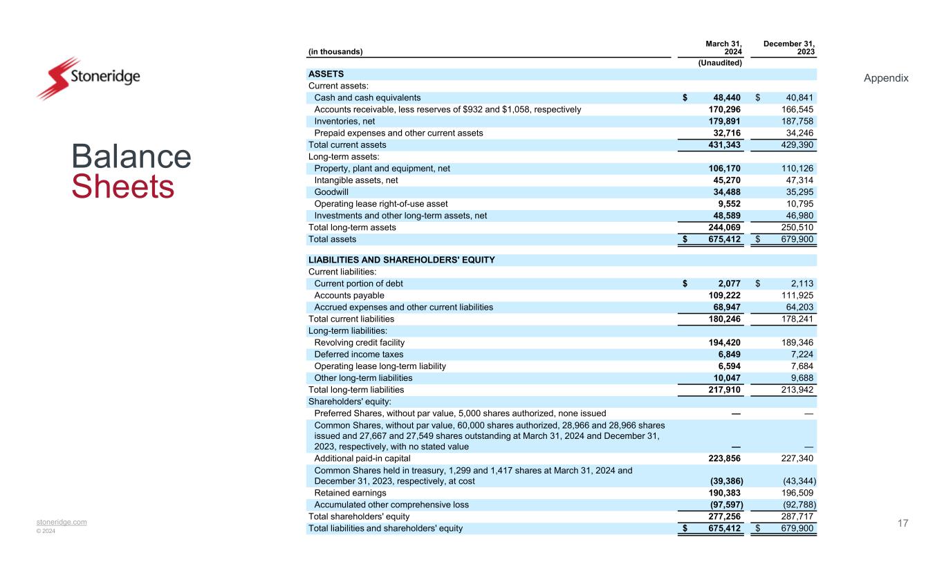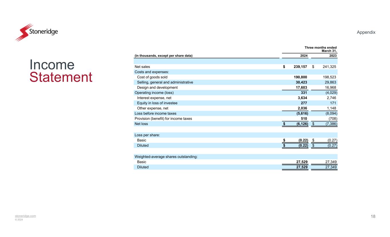 stoneridge.com © 2024 Appendix 17 Balance Sheets December 31, 2023 March 31, 2024(in thousands) (Unaudited) ASSETS Current assets: $ 40,841$ 48,440Cash and cash equivalents 166,545170,296Accounts receivable, less reserves of $932 and $1,058, respectively 187,758179,891Inventories, net 34,24632,716Prepaid expenses and other current assets 429,390431,343Total current assets Long-term assets: 110,126106,170Property, plant and equipment, net 47,31445,270Intangible assets, net 35,29534,488Goodwill 10,7959,552Operating lease right-of-use asset 46,98048,589Investments and other long-term assets, net 250,510244,069Total long-term assets $ 679,900$ 675,412Total assets LIABILITIES AND SHAREHOLDERS' EQUITY Current liabilities: $ 2,113$ 2,077Current portion of debt 111,925109,222Accounts payable 64,20368,947Accrued expenses and other current liabilities 178,241180,246Total current liabilities Long-term liabilities: 189,346194,420Revolving credit facility 7,2246,849Deferred income taxes 7,6846,594Operating lease long-term liability 9,68810,047Other long-term liabilities 213,942217,910Total long-term liabilities Shareholders' equity: ——Preferred Shares, without par value, 5,000 shares authorized, none issued —— Common Shares, without par value, 60,000 shares authorized, 28,966 and 28,966 shares issued and 27,667 and 27,549 shares outstanding at March 31, 2024 and December 31, 2023, respectively, with no stated value 227,340223,856Additional paid-in capital (43,344)(39,386) Common Shares held in treasury, 1,299 and 1,417 shares at March 31, 2024 and December 31, 2023, respectively, at cost 196,509190,383Retained earnings (92,788)(97,597)Accumulated other comprehensive loss 287,717277,256Total shareholders' equity $ 679,900$ 675,412Total liabilities and shareholders' equity