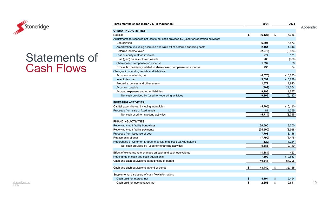 stoneridge.com © 2024 Appendix 19 Statements of Cash Flows 20232024Three months ended March 31, (in thousands) OPERATING ACTIVITIES: $ (7,386)$ (6,126)Net loss Adjustments to reconcile net loss to net cash provided by (used for) operating activities: 6,5736,601Depreciation 1,9462,164Amortization, including accretion and write-off of deferred financing costs (2,536)(2,279)Deferred income taxes 171277Loss of equity method investee (886)266Loss (gain) on sale of fixed assets 691,092Share-based compensation expense 34230Excess tax deficiency related to share-based compensation expense Changes in operating assets and liabilities: (16,833)(6,676)Accounts receivable, net (15,228)3,699Inventories, net 1,9431,377Prepaid expenses and other assets 21,264(709)Accounts payable 1,6879,193Accrued expenses and other liabilities (9,182)9,109Net cash provided by (used for) operating activities INVESTING ACTIVITIES: (10,110)(5,795)Capital expenditures, including intangibles 1,35581Proceeds from sale of fixed assets (8,755)(5,714)Net cash used for investing activities FINANCING ACTIVITIES: 8,00030,500Revolving credit facility borrowings (8,568)(24,500)Revolving credit facility payments 8,1487,798Proceeds from issuance of debt (8,475)(7,790)Repayments of debt (1,224)(620)Repurchase of Common Shares to satisfy employee tax withholding (2,119)5,388Net cash provided by (used for) financing activities 423(1,184)Effect of exchange rate changes on cash and cash equivalents (19,633)7,599Net change in cash and cash equivalents 54,79840,841Cash and cash equivalents at beginning of period $ 35,165$ 48,440Cash and cash equivalents at end of period Supplemental disclosure of cash flow information: $ 2,494$ 4,194Cash paid for interest, net $ 2,611$ 2,653Cash paid for income taxes, net