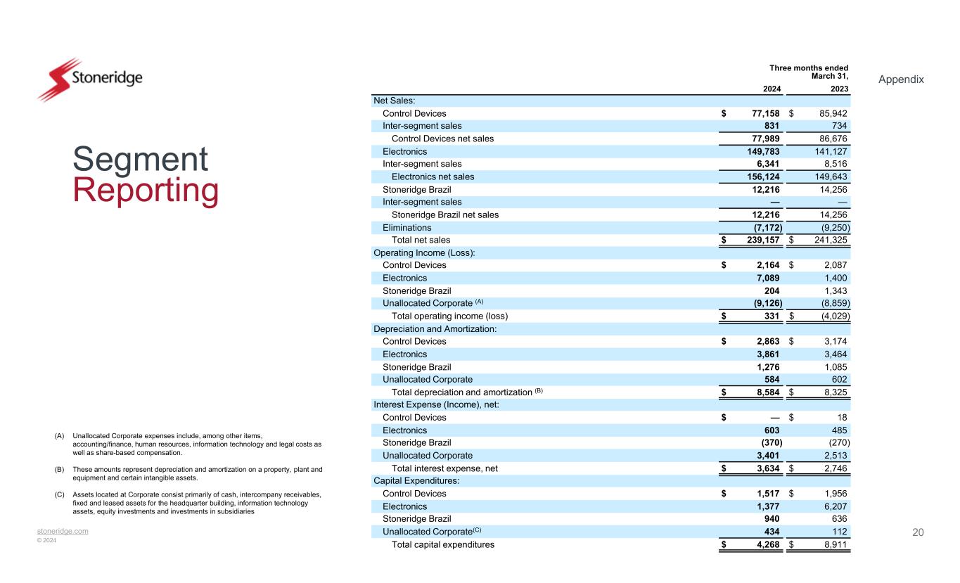 stoneridge.com © 2024 Appendix 20 Segment Reporting (A) Unallocated Corporate expenses include, among other items, accounting/finance, human resources, information technology and legal costs as well as share-based compensation. (B) These amounts represent depreciation and amortization on a property, plant and equipment and certain intangible assets. (C) Assets located at Corporate consist primarily of cash, intercompany receivables, fixed and leased assets for the headquarter building, information technology assets, equity investments and investments in subsidiaries Three months ended March 31, 20232024 Net Sales: $ 85,942$ 77,158Control Devices 734831Inter-segment sales 86,67677,989Control Devices net sales 141,127149,783Electronics 8,5166,341Inter-segment sales 149,643156,124Electronics net sales 14,25612,216Stoneridge Brazil ——Inter-segment sales 14,25612,216Stoneridge Brazil net sales (9,250)(7,172)Eliminations $ 241,325$ 239,157Total net sales Operating Income (Loss): $ 2,087$ 2,164Control Devices 1,4007,089Electronics 1,343204Stoneridge Brazil (8,859)(9,126)Unallocated Corporate (A) $ (4,029)$ 331Total operating income (loss) Depreciation and Amortization: $ 3,174$ 2,863Control Devices 3,4643,861Electronics 1,0851,276Stoneridge Brazil 602584Unallocated Corporate $ 8,325$ 8,584Total depreciation and amortization (B) Interest Expense (Income), net: $ 18$ —Control Devices 485603Electronics (270)(370)Stoneridge Brazil 2,5133,401Unallocated Corporate $ 2,746$ 3,634Total interest expense, net Capital Expenditures: $ 1,956$ 1,517Control Devices 6,2071,377Electronics 636940Stoneridge Brazil 112434Unallocated Corporate(C) $ 8,911$ 4,268Total capital expenditures