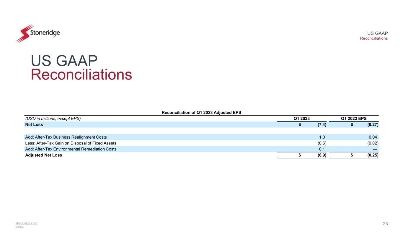 stoneridge.com © 2024 US GAAP Reconciliations US GAAP Reconciliations 22 This document contains information about Stoneridge's financial results which is not presented in accordance with accounting principles generally accepted in the United States ("GAAP"). Such non-GAAP financial measures are reconciled to their closest GAAP financial measures in the appendix of this document. The provision of these non-GAAP financial measures is not intended to indicate that Stoneridge is explicitly or implicitly providing projections on those non- GAAP financial measures, and actual results for such measures are likely to vary from those presented. The reconciliations include all information reasonably available to the Company at the date of this document and the adjustments that management can reasonably predict.