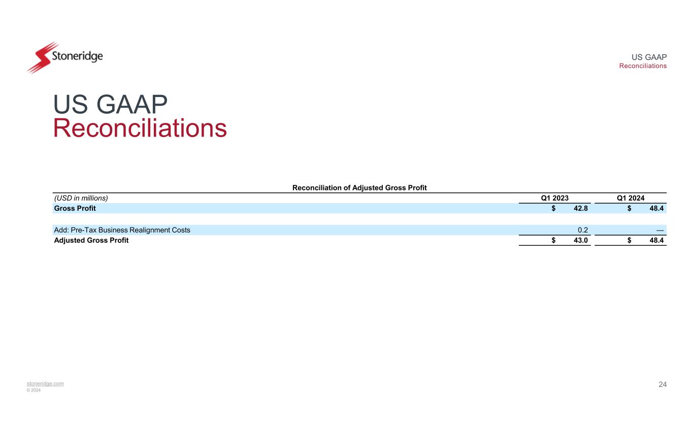 stoneridge.com © 2024 US GAAP Reconciliations 23 US GAAP Reconciliations Reconciliation of Q1 2023 Adjusted EPS Q1 2023 EPSQ1 2023(USD in millions, except EPS) $ (0.27)$ (7.4)Net Loss 0.041.0Add: After-Tax Business Realignment Costs (0.02)(0.6)Less: After-Tax Gain on Disposal of Fixed Assets —0.1Add: After-Tax Environmental Remediation Costs $ (0.25)$ (6.9)Adjusted Net Loss