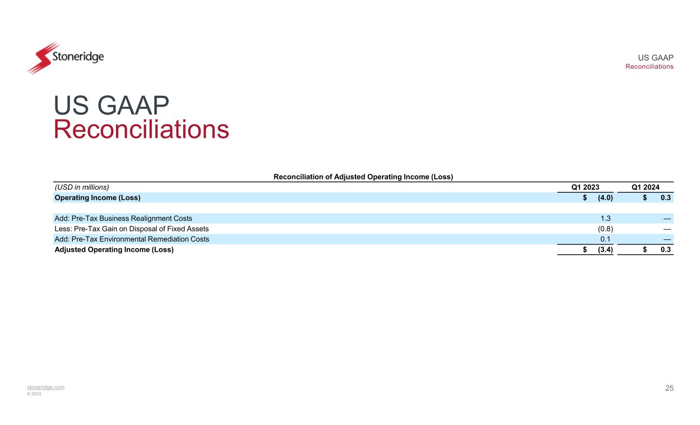 stoneridge.com © 2024 US GAAP Reconciliations 24 US GAAP Reconciliations Reconciliation of Adjusted Gross Profit Q1 2024Q1 2023(USD in millions) $ 48.4$ 42.8Gross Profit —0.2Add: Pre-Tax Business Realignment Costs $ 48.4$ 43.0Adjusted Gross Profit