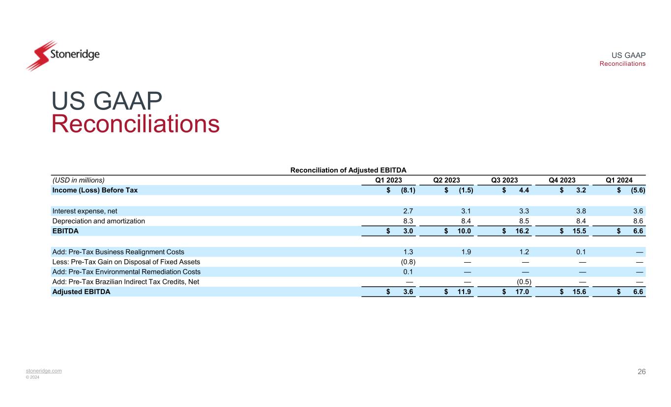 stoneridge.com © 2024 US GAAP Reconciliations 25 US GAAP Reconciliations Reconciliation of Adjusted Operating Income (Loss) Q1 2024Q1 2023(USD in millions) $ 0.3$ (4.0)Operating Income (Loss) —1.3Add: Pre-Tax Business Realignment Costs —(0.8)Less: Pre-Tax Gain on Disposal of Fixed Assets —0.1Add: Pre-Tax Environmental Remediation Costs $ 0.3$ (3.4)Adjusted Operating Income (Loss)